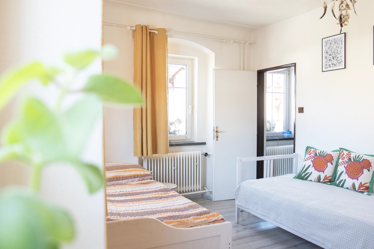 Ubytujte se v pohodlném bytě se dvěma samostatnými pokoji, koupelnou, kuchyní a příjemným posezením. Ideální třeba pro jednu větší rodinu, pro dvě rodiny s dětmi, které vyráží na společný výlet nebo pro dva páry. Už u nás bydlela i partička deseti lidí, kterým nevadí společné ložnice, celý den jsou totiž venku. Ale můžete tu být i jen ve dvou :)