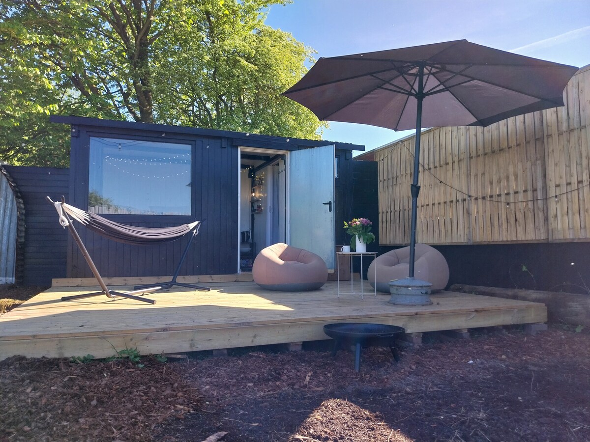 Cozy annex/backhouse with a private living area, sleeping space, and kitchenette – Please note: Bathroom, kitchen, and a small gym are located in a separate building just 10 meters away. Outdoor area with a fire pit and grill, peace and quiet. We live on the farm ourselves in case you need anything. An ideal spot for both a weekday escape and focused work. At the same time, close to the Higway, so you can get on quickly.