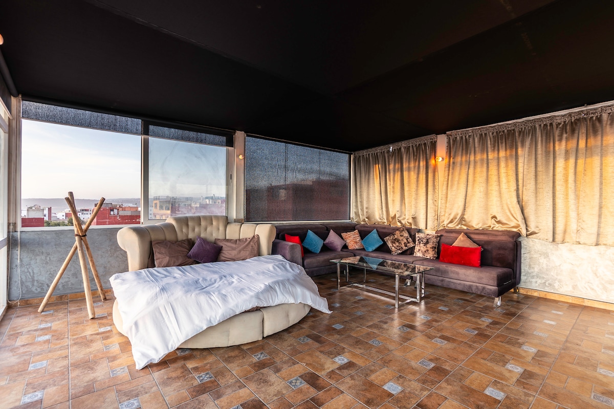 Vivez une expérience de luxe dans notre élégant duplex à Tamraght. Idéal pour les couples ou familles, il offre une terrasse privée sur le toit et un jacuzzi et une vue imprenable sur l'océan. Profitez du confort, de l'intimité et des couchers de soleil inoubliables à quelques minutes des célèbres spots de surf.