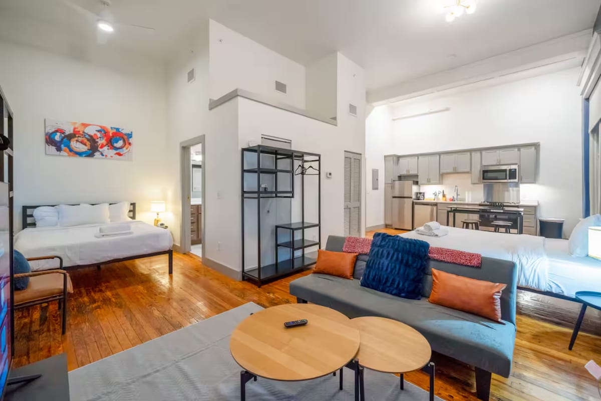 Maksimum 4 qonaq üçün mükəmməl olan bu yüksək səviyyəli mənzildən Luisvili dəbli şəkildə təcrübədən keçirin. Yaddaş köpüyü olan king ölçülü çarpayıda və ya yaddaş köpüyü olan queen ölçülü divan-çarpayıda rahat yatın, sonra isə səhərinizi pulsuz qəhvə ilə başlayın. Çölə çıxın və piyada gedə biləcəyiniz nahar, əyləncə və 4-cü küçəni kəşf edin! Virtual qolf, 24/7 idman zalı və ya Hulu və Disney+ ilə film gecəsi ilə dincəlin. Rahatlıq, rahatlıq və əsl şəhər təcrübəsi üçün bu gün bizimlə qonaqlamanızı bron edin!