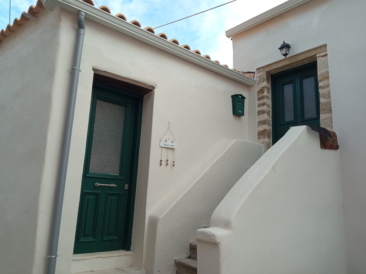 Mənzilimiz Aqioi Douloi kəndinin kənarında, sakit, sakit bir məhəllədə yerləşir. İki mərtəbəni əhatə edir və kiçik tərəvəz bağı və nəsildən-nəsilə keçən çoxəsrlik zeytun ağacları olan 6 hektarlıq mülkdə iki əsrlik ailə mülkünün bir hissəsidir. Aralıq dənizi üslublu bağda rozmarin, banan bitkiləri, çiçəklər, üzüm, əncir ağacı və əlbəttə ki, malikanənin simvolik qədim zeytun ağacları var.