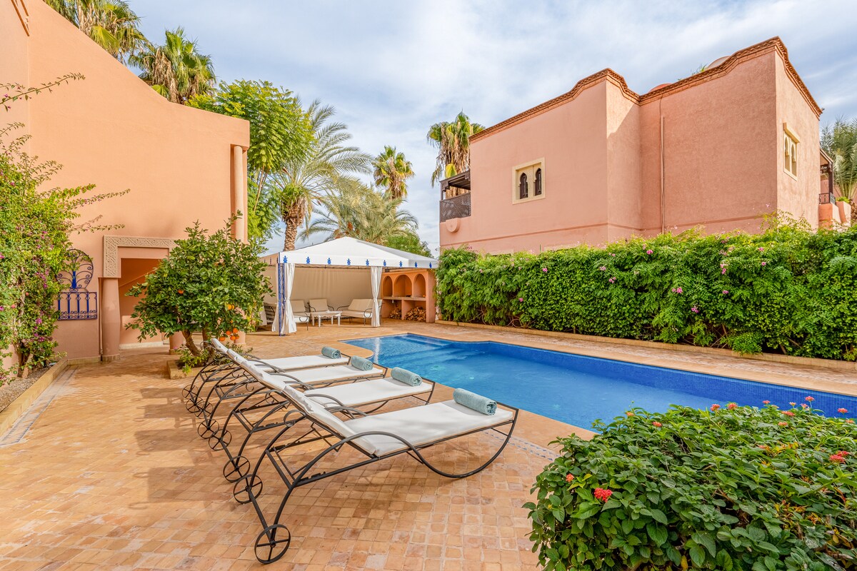 Villa située à +/- 30 minutes de Gueliz et de la médina dans un charmant domaine sécurisé 24/7 avec un terrain de tennis commun et de piscine privées. La villa se compose de 3 tres grandes suites avec chacune leur cheminée, leur télé (Netflix gratuit), 3 salles de bain, d'une petite piscine intérieure chauffée, d'une piscine extérieure privative et d'un jardin privatif sans vis à vis, d'un salon avec cheminée. Table à manger convertible en billard ou en table de ping-pong. Villa au calme.