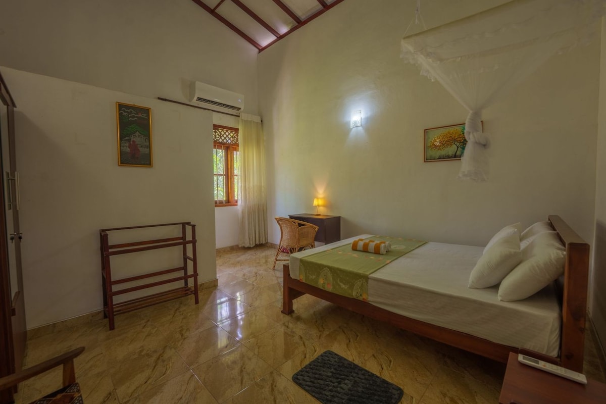 Bask in the serene ambiance of this modern 1st-floor apartment, lovingly hosted by a warm local Sri Lankan family. Relax in a peaceful setting away from busy roads, and admire lush greenery from your balcony. Head to the rooftop terrace for yoga or soak up the treetop views. Located just minutes from Ahangama’s center, the simple yet stylish design promises comfort and privacy, while you enjoy genuine island hospitality.