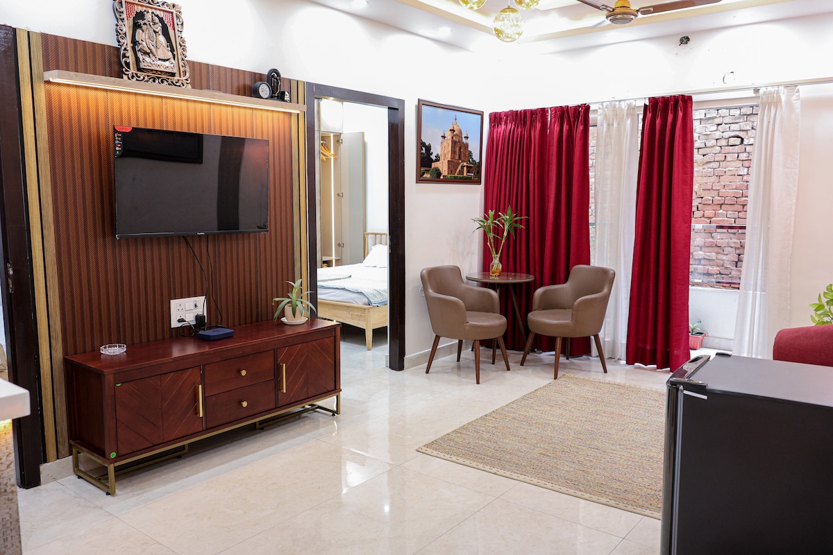 Bu müasir/qəşəng lüks nömrə Mülki Xətlərin yaxınlığında yerləşir (Dəmiryol Stansiyası- 10mins, Hava Limanı- 20 dəq, Yüksək Məhkəmə- 5dəq) Xüsusi oxu məkanı ilə rahatlıq üçün hazırlanıb. Bundan əlavə, açıq havada oturma bir fincan "Çay/Qəhvə" üzərində mənalı söhbətlər etmək üçün mükəmməl bir yerdir. Süita müstəqil evin birinci mərtəbəsində yerləşir və Ağıllı Kilid və CCTV ilə təmin edilmiş ayrıca girişə malikdir. Qonaqlamalar zamanı təcrübənizi yüksəltmək üçün yüksək keyfiyyətli imkanlara malikdir