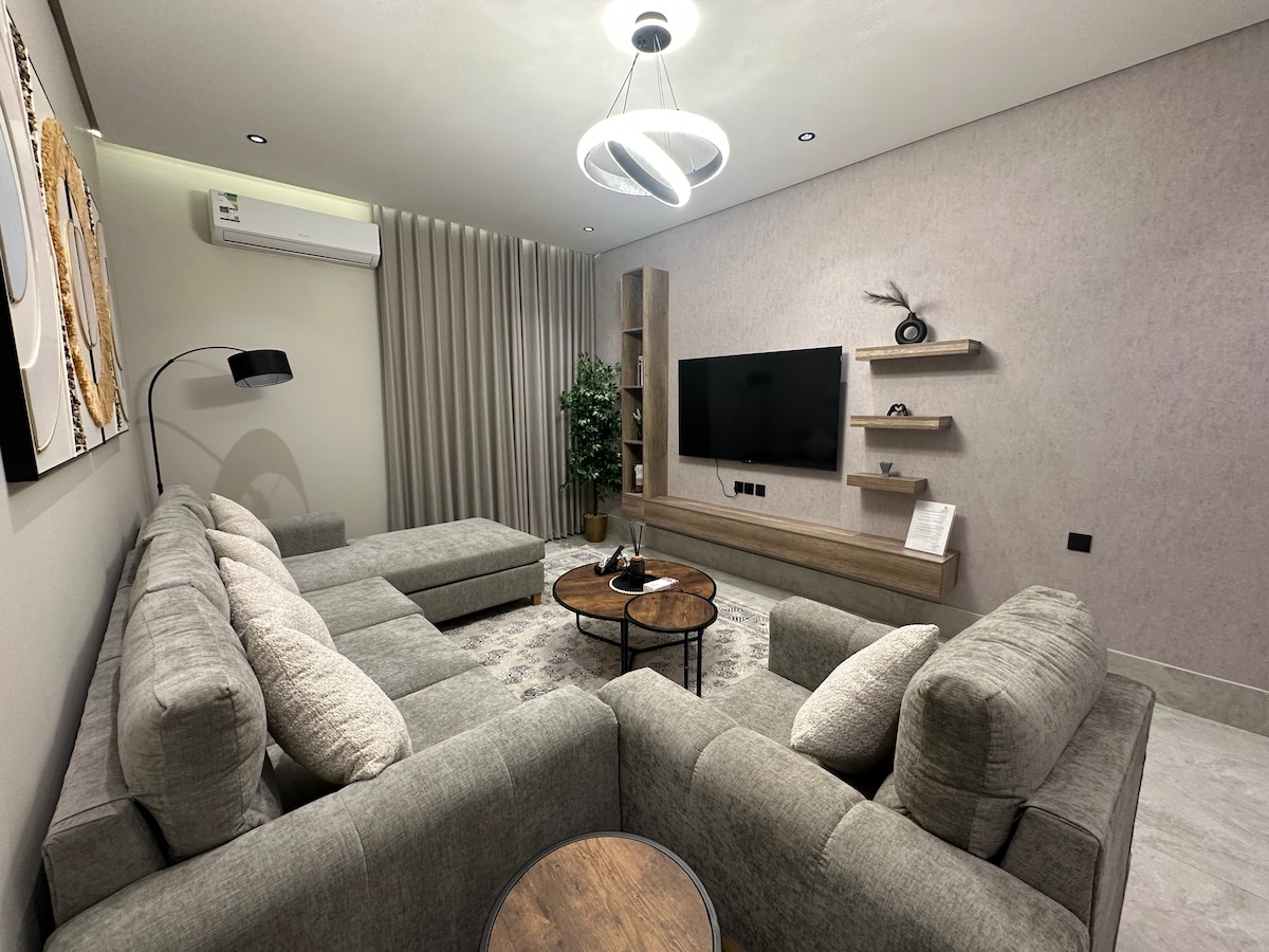Əl-Xobar şəhərində rahat mənzildə fərqli bir qonaqlama kəşf edin. Mənzil bir neçə xüsusiyyətə malikdir: 1. Ağıllı qapı kilidindən ağıllı və təhlükəsiz giriş. 2. Mənzərəli gözəl balkon. 3. Qəhvə maşını, mikrodalğalı soba və kiçik soyuducu ilə təchiz olunmuş qəhvə guşəsi. 4. 4K ağıllı ekran. 5. Sürətli 5G internet bağlantısı. 1. Bəhreyn Körpüsü - 5 dəqiqə ərzində. 2. Rəşid Mall - 10 dəqiqə. 3. Sahilyanı ərazi - 5 dəqiqə.