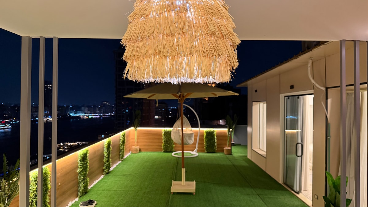 Misirin mərkəzində Nil çayına açılan heyrətamiz mənzərəsi olan ayrıca damlı mənzildə qonaqlamaqdan zövq alın! Pəncərələrdən panoramik mənzərələr, dəbli və müasir interyer dekorasiyası buranı istirahət və sakitlik üçün ideal məkana çevirir. Piramidalar, Sfinks və Misir Muzeyi kimi məşhur turistik yerlərə yaxın yerləşir və Four Seasons və Fairmont Nil Şəhəri kimi yüksək reytinqli otellərlə əhatə olunub. Dəbdəbəli və unudulmaz qonaqlama üçün indi bron edin.