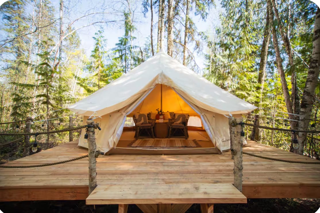 Kurortumuza Ceyms çayına yaxın böyük kətan çadırı daxildir və Kanada səhrasında ağaclarla əhatə olunub. Rahat və sakit vaxt keçirməkdən zövq alın. Hələ də rahat şəkildə düşərgə təcrübəsi istəyən ailələr üçün əladır. Çadır iki nəfərlikdir, lakin maksimum dörd nəfərlik öz çadırınızı gətirə bilərsiniz. Qiymət ikiqat doluluğa əsaslanır. Əlavə qonaqlar üçün 35 $/adambaşına/gecə. Ev heyvanı yoxdur. Çadır qızdırılmır. İndi pulsuz Wİ-Fİ ilə!
