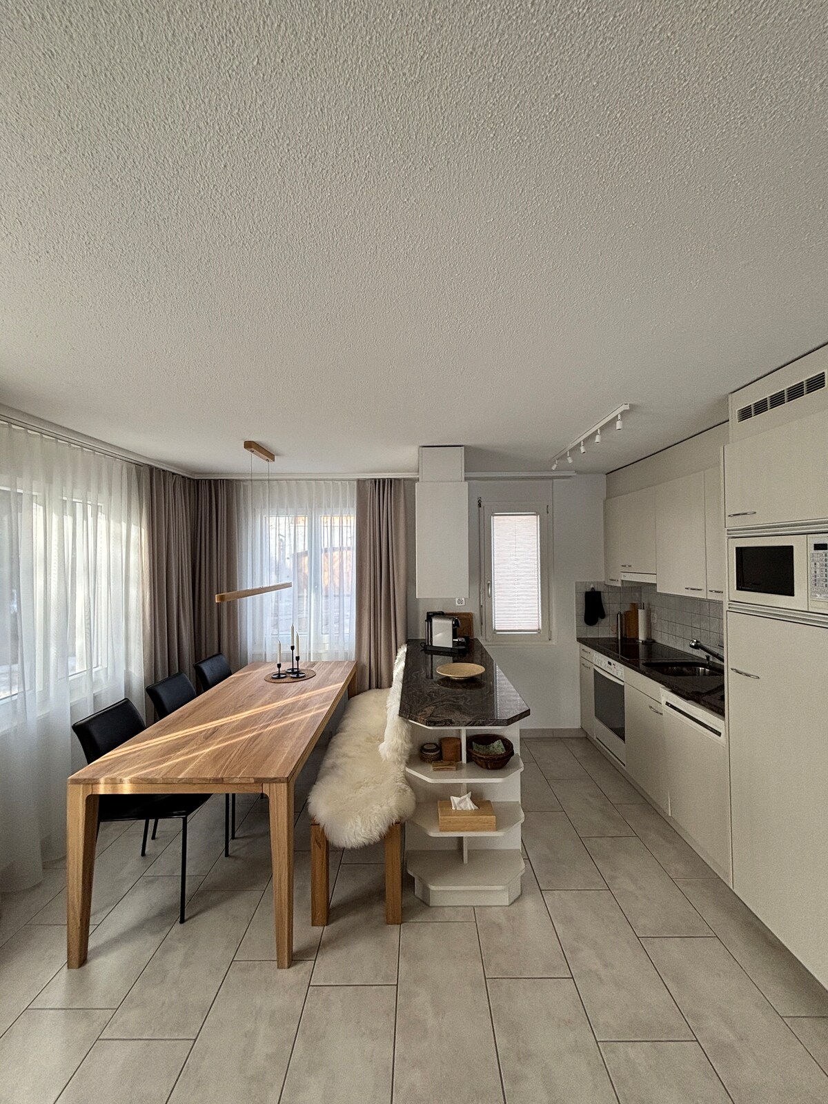The apartment is located in the heart of the world-famous resort of St. Moritz, just a 7-minute walk from the mountain railway. It is 30m2 in size and has been modernly renovated with wood. Enjoy the sun on the terrace. A large double bed, private underground parking space, modern bathroom, dining area, fast internet, smart speaker, Frame TV with Netflix, and a fully equipped kitchen area ensure you have a perfect stay. Swimming pool, sauna, fitness available for you during the high seasons.