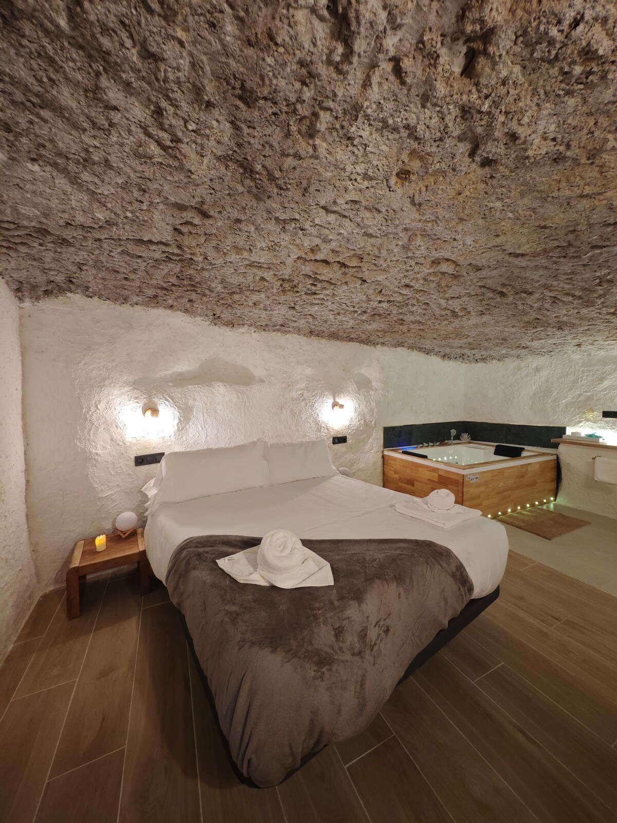 Alójate en está preciosa casa cueva y vive una experiencia diferente hasta ahora. Relájate en nuestro hidromasaje doble dentro de la cueva. Esta casa cueva está equipada con todo lo necesario para pasar unas buenas vacaciones. Cocina completa, hidromasaje, TV en salón y dormitorio, aire acondicionado, secador, plancha... NORMAS DE LA CASA: *No se admiten fiestas *Queda prohibido bajo sanción extraer o cavar en la cueva cualquier Amonite. *Se ruega tener precaución con la altura de la cueva