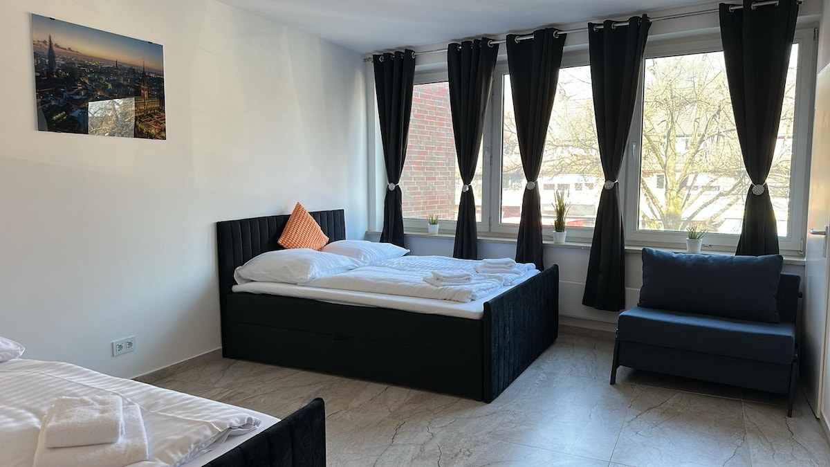 Ayrıca girişi və yüksək sürətli Wi-Fi olan müasir, geniş və tam təchiz olunmuş zirzəmi. Alster çayı və yürüyüş cığırı piyada məsafəsindədir. Alstertale ticarət mərkəzinə avtobusla 6 dəqiqəyə 3 dayanacaqla və ya piyada 20 dəqiqəyə çatmaq olar. Hamburq Hava Limanına avtomobillə cəmi 15 dəqiqə, ictimai nəqliyyat vasitələri ilə isə təxminən 30 dəqiqə ərzində çatmaq olar. Mərkəzi qatar stansiyasına təxminən 40-50 dəqiqə ərzində avtobus və qatarla getmək olar. Küçədə evin qarşısında pulsuz parkinq mövcuddur.
