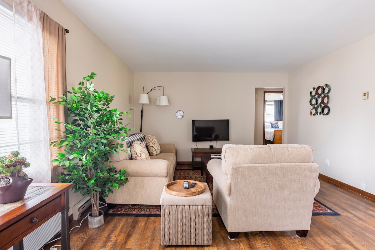 Bu, bir yataq otaqlı mənzildir (ikinci mərtəbə). İllinoys ştatının Şərqi Molayn şəhərində yerləşir. Tarixi rayonun bir hissəsi olan Şərqi Molin Şəhər Mərkəzi dəmir yoluna yaxın yerləşir, buna görə də vaxtaşırı qatar səsi eşidə bilərsiniz. Bar və restoranlara yaxındır. Wi-Fi girişi (xidmət təminatçısının etibarlılığına əsasən). Bir neçə dəqiqəlik məsafədə John Deere Harvester, John Deere Pavilion, The Rust Belt, The Bend Center, John Deere Classic, Tax slayer Center kimi yerlər var.