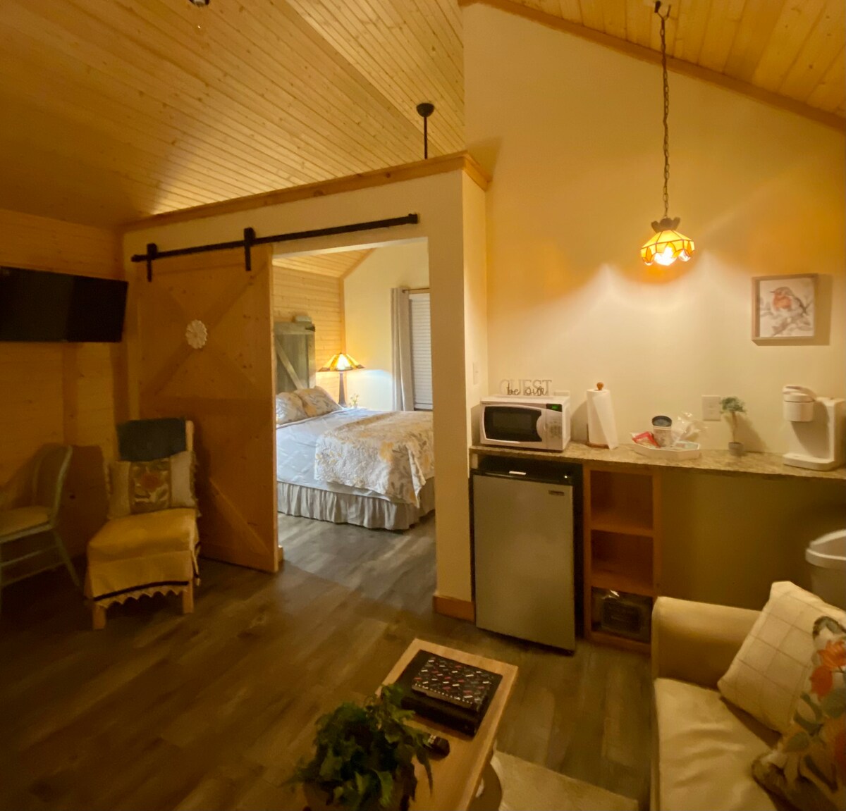 Serenity and seclusion awaits you at Busha's Barn. The nicely appointed studio has everything you need to enjoy your visit. The kitchen has a full refrigerator, convection/microwave, two eye burner, coffee pot, toaster. Relax on the couch and watch tv or take a nap in the comfortable queen size bed. If you are working from home there is a desk and of course wfi. Situated on a heavily wooded acre surrounded by birds and wildlife. Take a short hike down the path to Beaver Creek.