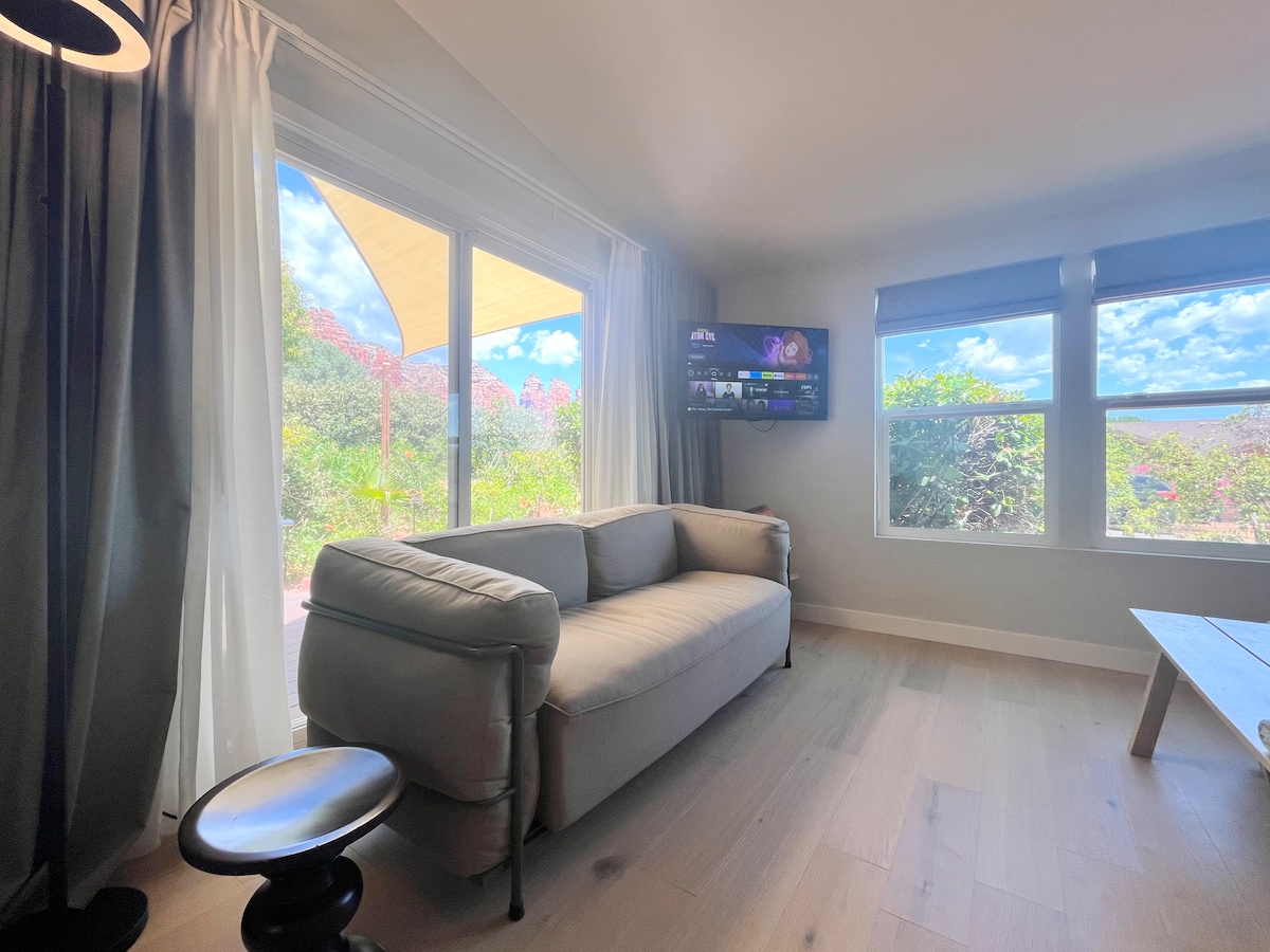 Love is all around at Cosmic Bloom Cottage ❤️ your Luxe Sedona getaway. This newly remodeled King Bedroom Suite for two features large windows with amazing views, premium bed, designer sofa, elegant bathroom and fully equipped kitchenette with cozy outdoor seating. A hidden gem, enjoy feeling worlds away while centrally located and at the base of several trailheads. Unwind in nature, treat yourself to an abundance of excellent eateries, or try out a unique and transformative healing experience.