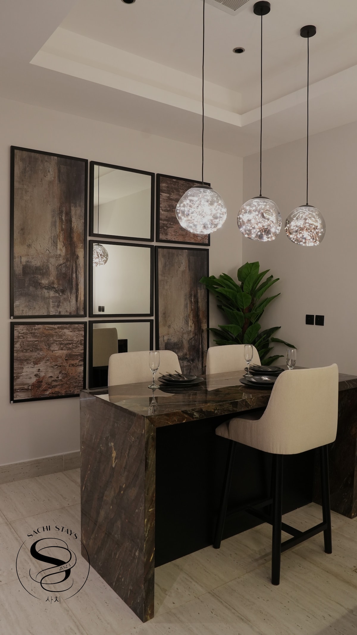 Ər-Riyadın ən yaxşı məhəllələrindən birində yerləşən və KAFD-nin heyrətamiz mənzərəsi olan müstəsna qonaqlama üçün nəzərdə tutulmuş müasir mənzil. Burada xoş axşamlar üçün ekranı və proyektoru olan açıq havada oturma sahəsi var. Rahatlığınız üçün çarpayıya yüksək keyfiyyətli 14 sm əlavə qat daxildir. "Həmçinin əvvəlcədən bron etməklə əlavə ödənişlə xüsusi hallar (tort və aksessuarlar daxil olmaqla) üçün tədbir koordinasiyası xidmətləri təklif edirik və unudulmaz təcrübə təmin edirik "