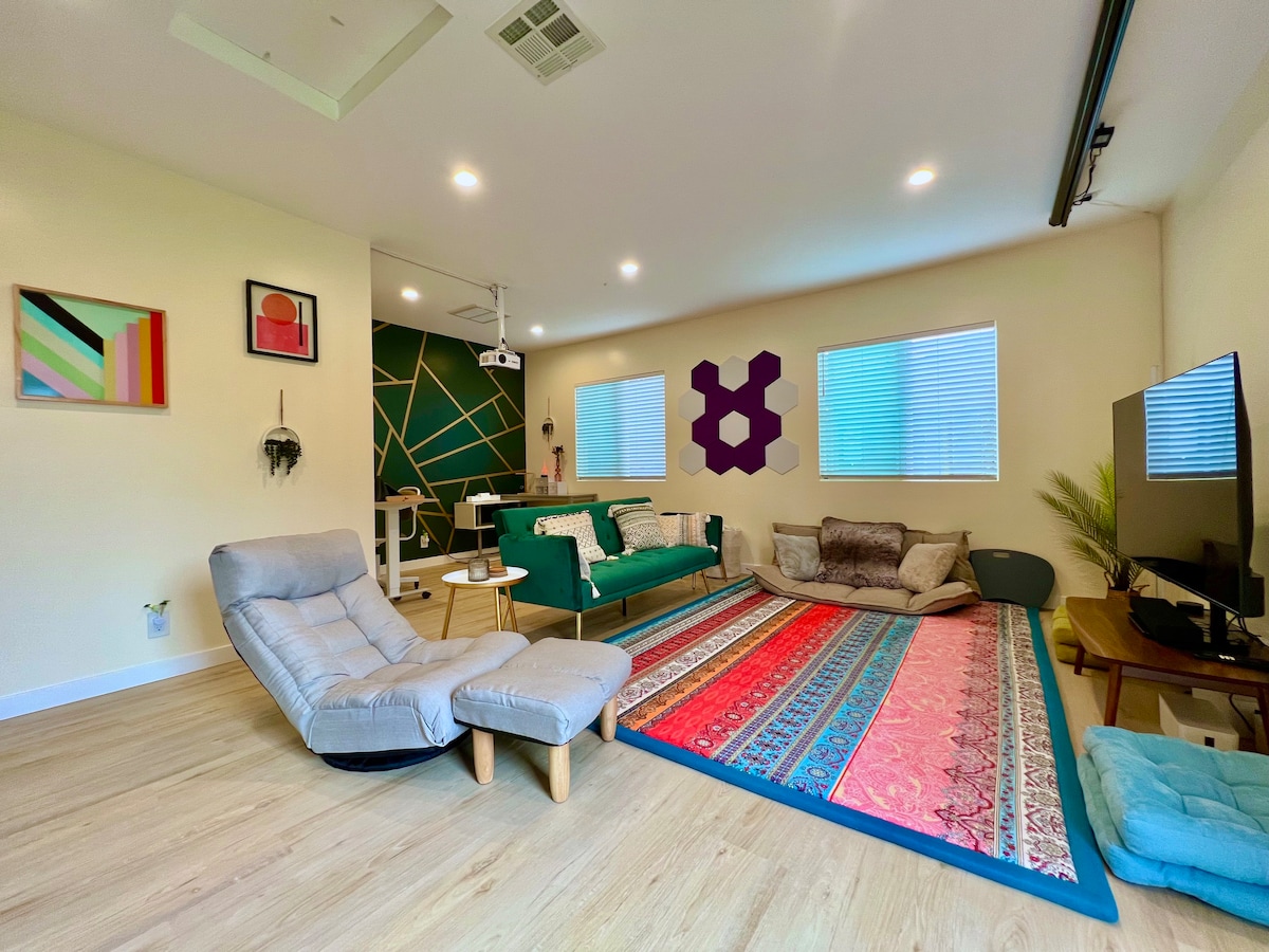 Atwater Village-in bütün dəbli mağazaları, barları və restoranları ilə əsas zolaqdan cəmi 1 1/2 blok aralıda öz gözəl tənha məkanınızdan zövq alın. Geniş açıq verandada bambukda dincəlin, bir qədər şam yeməyini yığışdırın və ya 120" proyeksiya ekranı və ətraf səs sistemi ilə öz şəxsi film teatrınızla əylənin. Bütün ev təbii işıqla doludur və istəyə görə əsas sürüşmə qapılarında günəş çalarları və qaralma çalarları var.