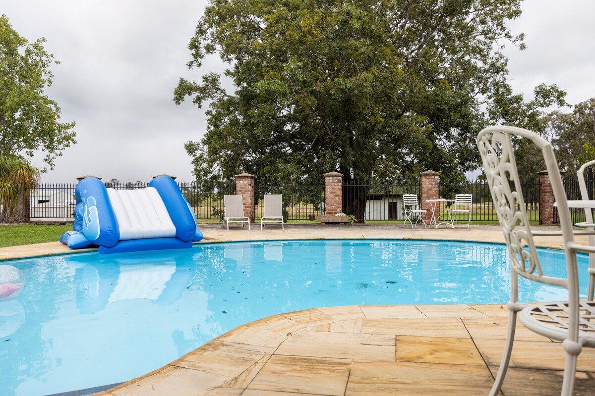 Nestled among old heritage gardens on 5 acres near Morpeth in the Hunter Valley, this gorgeous cottage is part of the Berry House Estate built in 1857. Cosy up and unwind, or explore the broader Hunter Valley. The self contained cottage (converted servants quarters), is your own little oasis within the broader grounds of Berry House. Use the pool and sauna, explore the gardens, collect some farm fresh eggs, feed the sheep or just chill. Delightful spot for kids with friendly cat and two dogs.