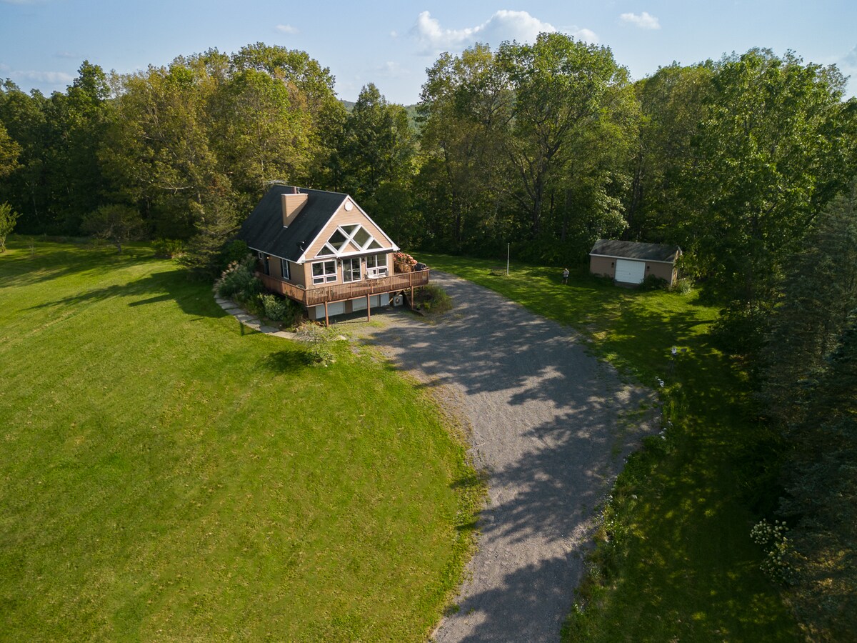 Enjoy expansive views of the Catskill Mountains from this renovated but rustic Scandinavian barn. Featured in many magazines and catalogues, including AirBnB Magazine. Walk the property, with its big open field, an organic orchard, walking paths, and flower gardens. A large private pond is swimmable (after heavy rains it does get muddy). The Barn has central heat and air conditioning. A full bathroom features an antique bathtub. Enjoy dining inside, or outdoor grilling and dining.