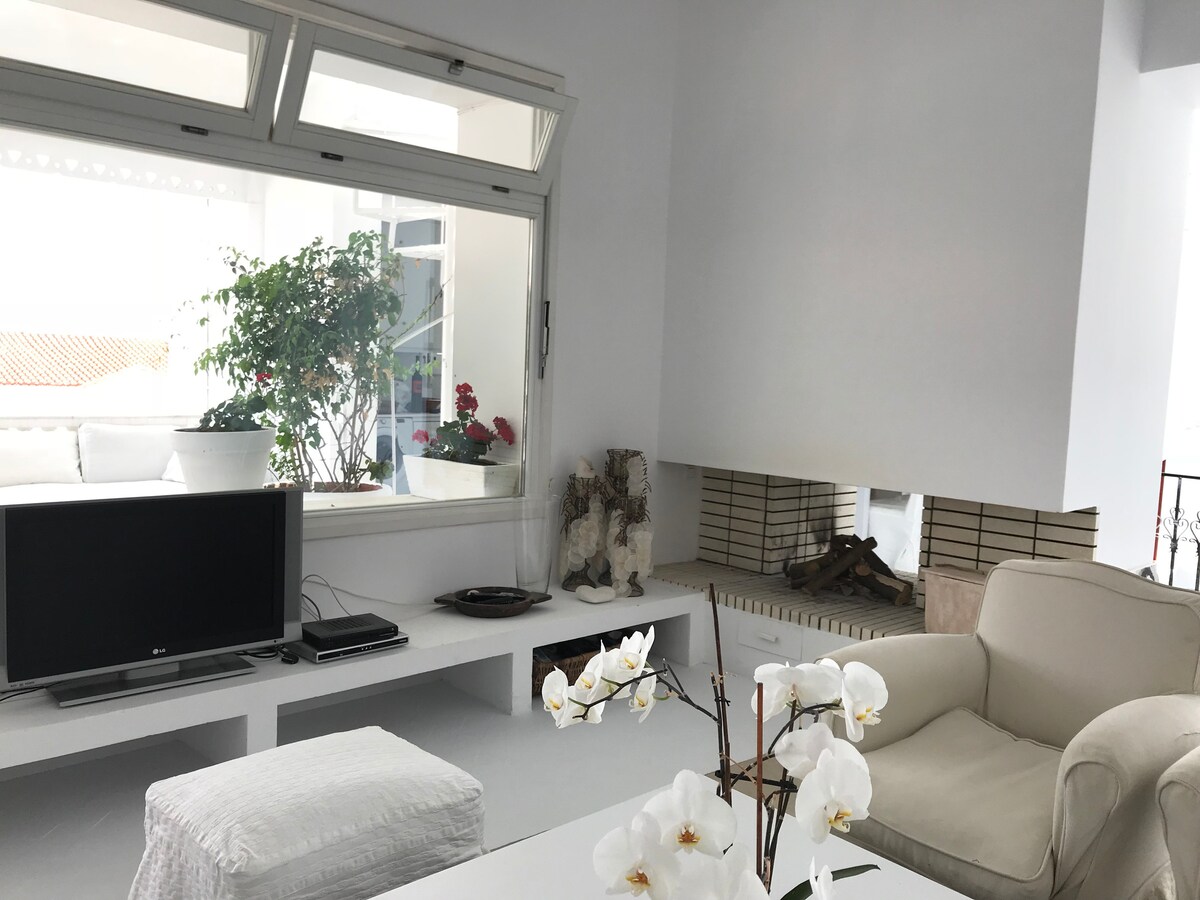 A bright, 19th century home with a long family history, with a balcony and terrace with a bar lounge area with an 180 Deg view of the sea, in the most picturesque setting in the Cycladic Islands, near a Venetian Castle, one minute walk for a swim,
