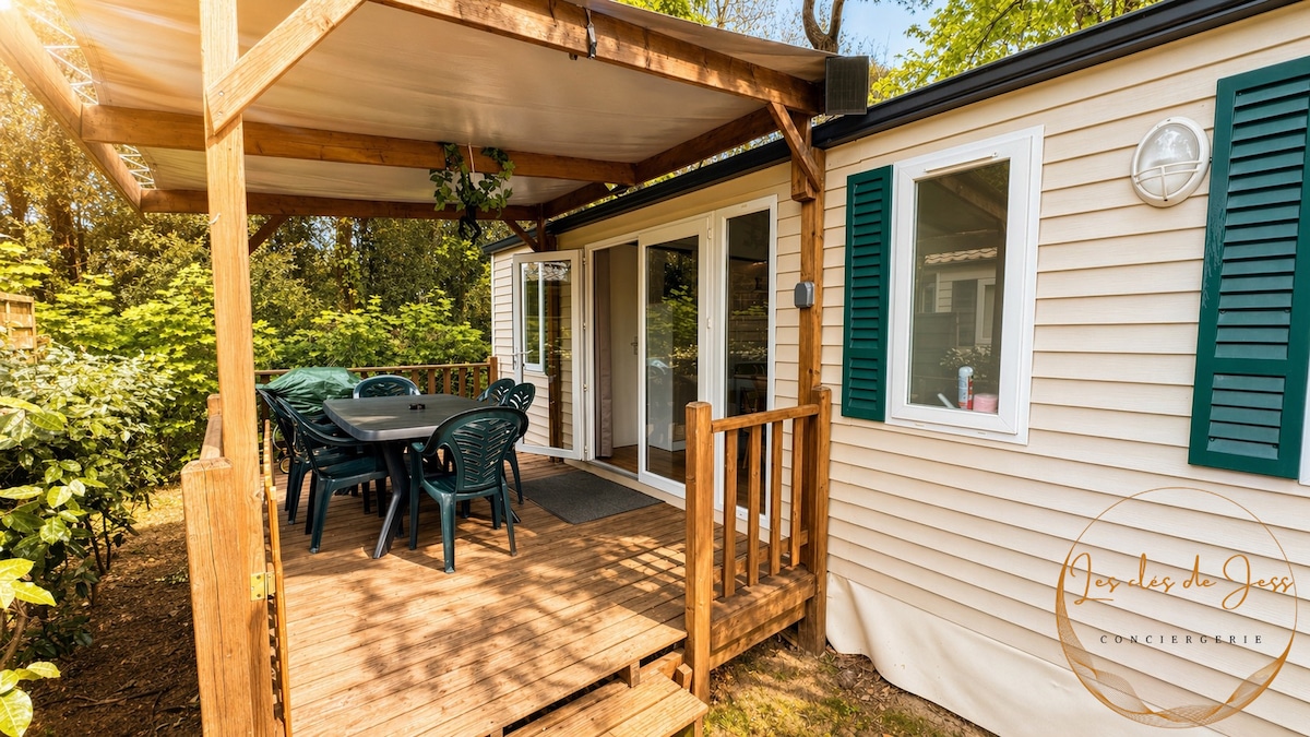 Qonaqpərvər dekorasiya, keyfiyyətli yataq dəsti, səliqəli xidmətlər, diqqətli sahiblər və sadə və sürətli öz-özünə giriş imkanı olan təmiz, sakit mobil ev axtarırsınız? Sizin üçün hazırlanıb. Sen-Jan-de-Mon şəhərində işgüzar və ya turizm məqsədli səfərləriniz üçün ideal olan bu müasir mobil ev çimərliklərə, dövlət meşəsinə, velosiped yollarına və bütün mağazalara yaxın, sakit və strateji mövqedə yerləşir.