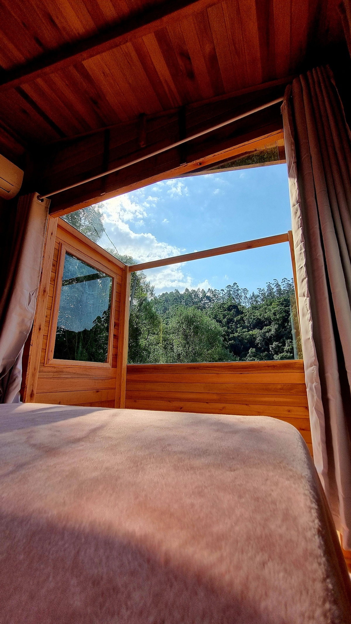 Bela Cabana, conta com uma bela vista do vale, acesso ao rio e às cachoeiras. Simplicidade e o conforto necessário. Ar quente e frio, Fogão a lenha e a gás, cama box casal, bons cobertores e travesseiros. Teto de vidro no quarto para contemplar as noites estreladas. Banheira simples para se refrescar nos dias quentes. Uma experiência autentica, vai além de uma Cabana, rotas com cachoeiras exclusivas, produtos coloniais, atividades recreativas, contato com a comunidade e cultura local.