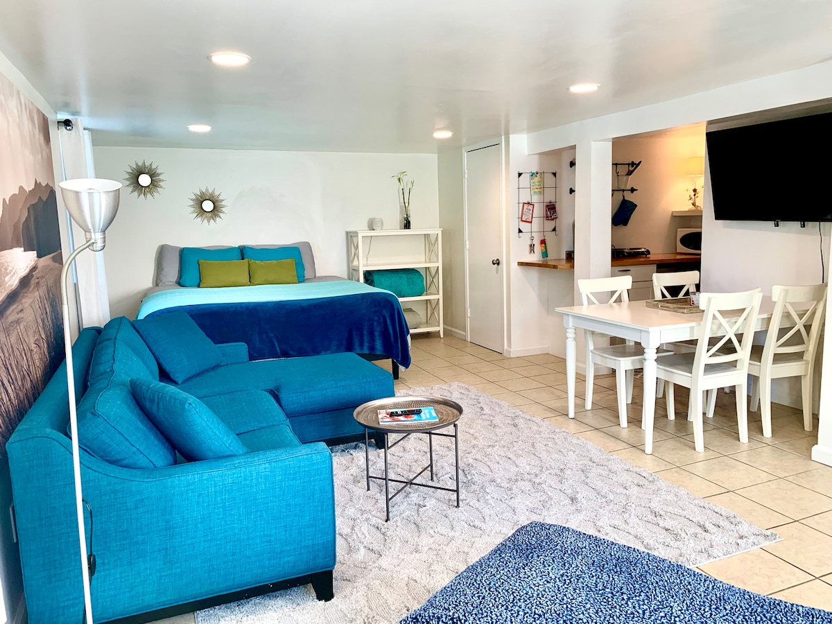 Discover our charming studio suite beneath a 1940s Tudor home. A cozy queen bed, sleeper sofa, Roku TV, and a private patio await. The kitchen is fully equipped, and a water filtration system ensures convenience. Ample storage and free street parking are provided. Walk to downtown Ypsilanti, and Ann Arbor is just 15 minutes away. Experience the perfect blend of comfort, character, and convenience in our delightful studio suite – the ideal choice for your next getaway.