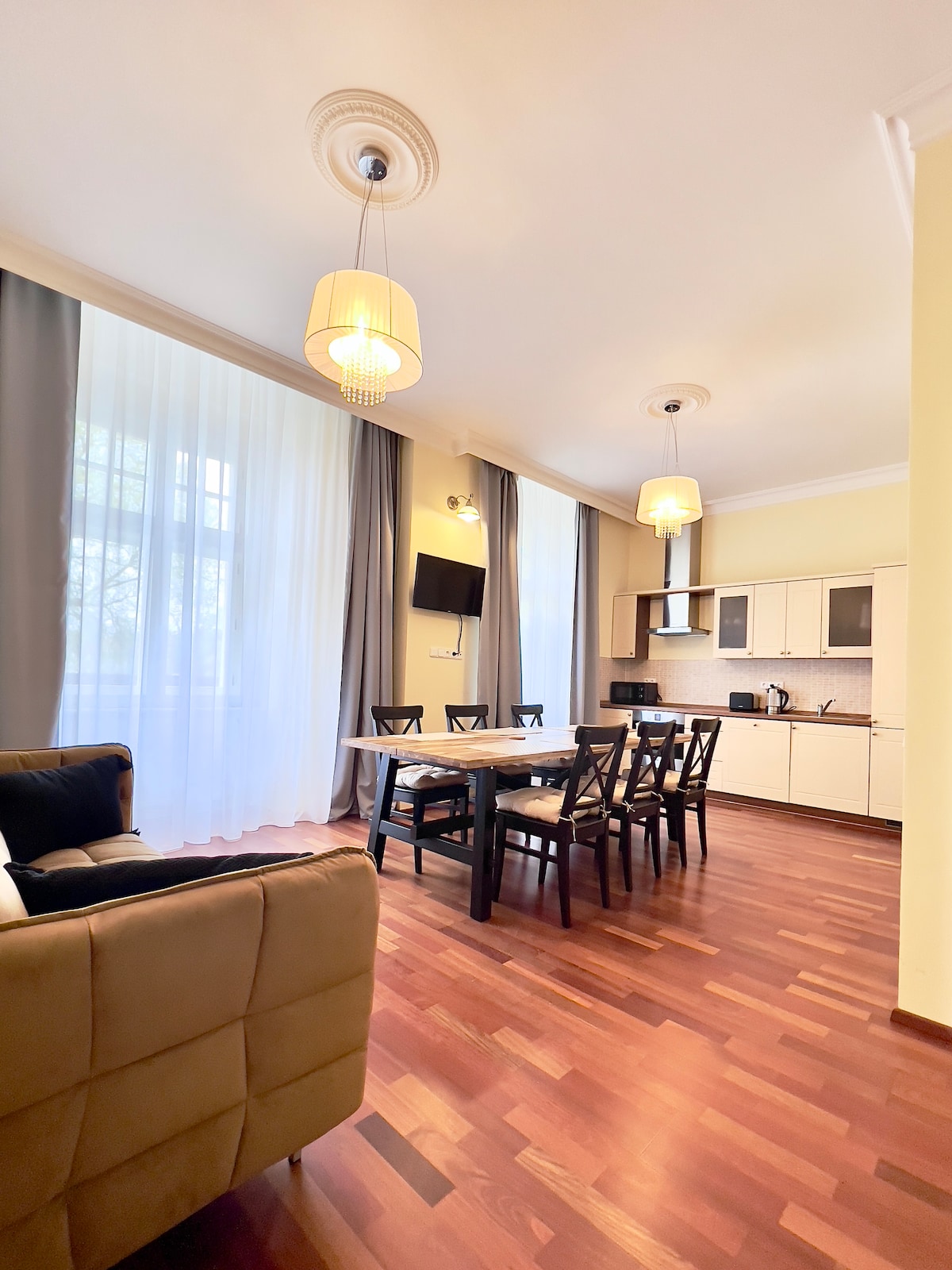 Spacious apartment with an absolutely unique location "in the centre of the centre" - at the beginning of the spa colonnade and near Masaryk Street, on which and in its surroundings are many good and affordable restaurants, bars, shops, etc. All rooms have views of Sadová kolonáda (the Park Colonnade) and the Thermal Hotel. The upper rooms have air conditioning. Kitchen is fully equipped. Free parking spot in a parking lot approx. 1.5 km from the apartment. Suitable for couples and families.