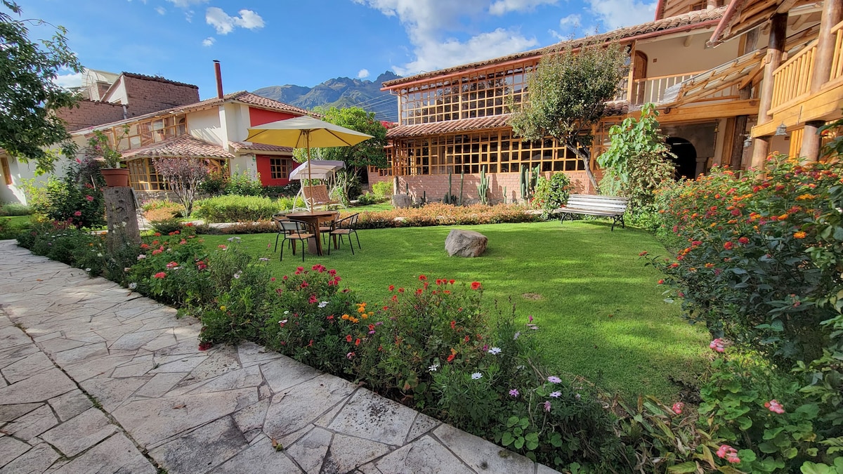 Disfruta de nuestra habitación con vista al jardín ofrece un espacio acogedor y tranquilo, ideal para parejas. Cuenta con cama matrimonial cómoda, baño privado y abundante luz natural, además de una hermosa vista al jardín andino del hotel, perfecta para relajarse y disfrutar la paz del Valle Sagrado.