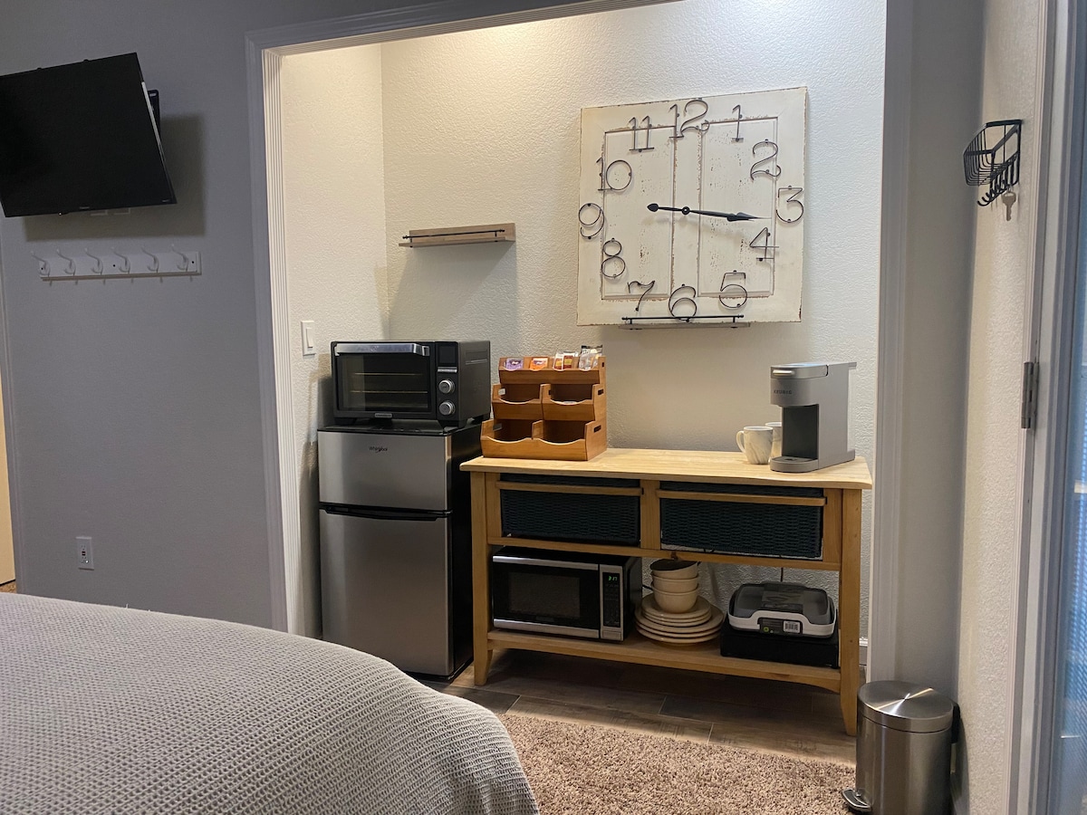 This is a single occupant only space as it shares a wall with our home. Enjoy your own space, bedroom (king bed), bathroom and kitchenette with private entrance and private patio. Please note heat/air is controlled by main house. Host on site, keurig coffee, cable tv. 15 Min. from historic Folsom, 24 Min. from Golden One Center, 24 Min. from Old Town Auburn. Please see "other details to note" for more information.