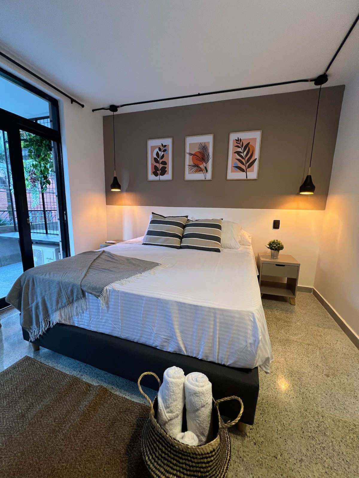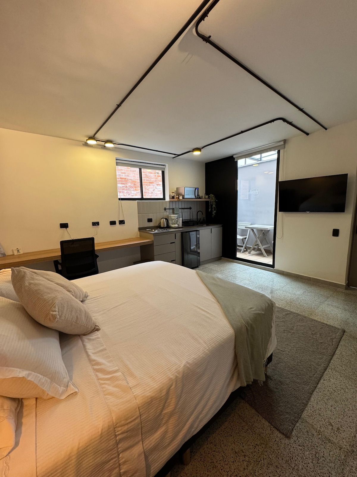 Modern apartment on the 17th floor of Hotel Urban Studios with amazing Medellin views. Just a 10-minute walk to Tesoro Mall and close to top nightlife, yet in a calm and pleasant area. Features a comfortable King bed, full kitchen, A/C, washing machine, gas dryer, fast Wi-Fi, and access to Al Alma restaurant with room service. The building includes a pool, jacuzzi, gym, work rooms and 24/7 security.
