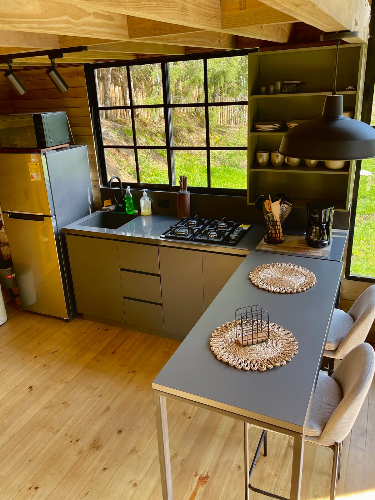 Imagina dormir en una cabaña de madera en una cama king con el arrullo del sonido del río. Al despertar te sentirás en una casa en el árbol con vista a los copos llenos de pájaros, bajar al jardín con los pies descalzos, desayunar en el deck y ver el horizonte. En el día caminar, ir al río y la cascada, llegar al baño en piedra y a la hidromasaje, sentarte en la hamaca, leer y en la noche encender la chimenea (salamandra), tomarte un vino en el mesón de la cocina en pareja, familia y amigos.