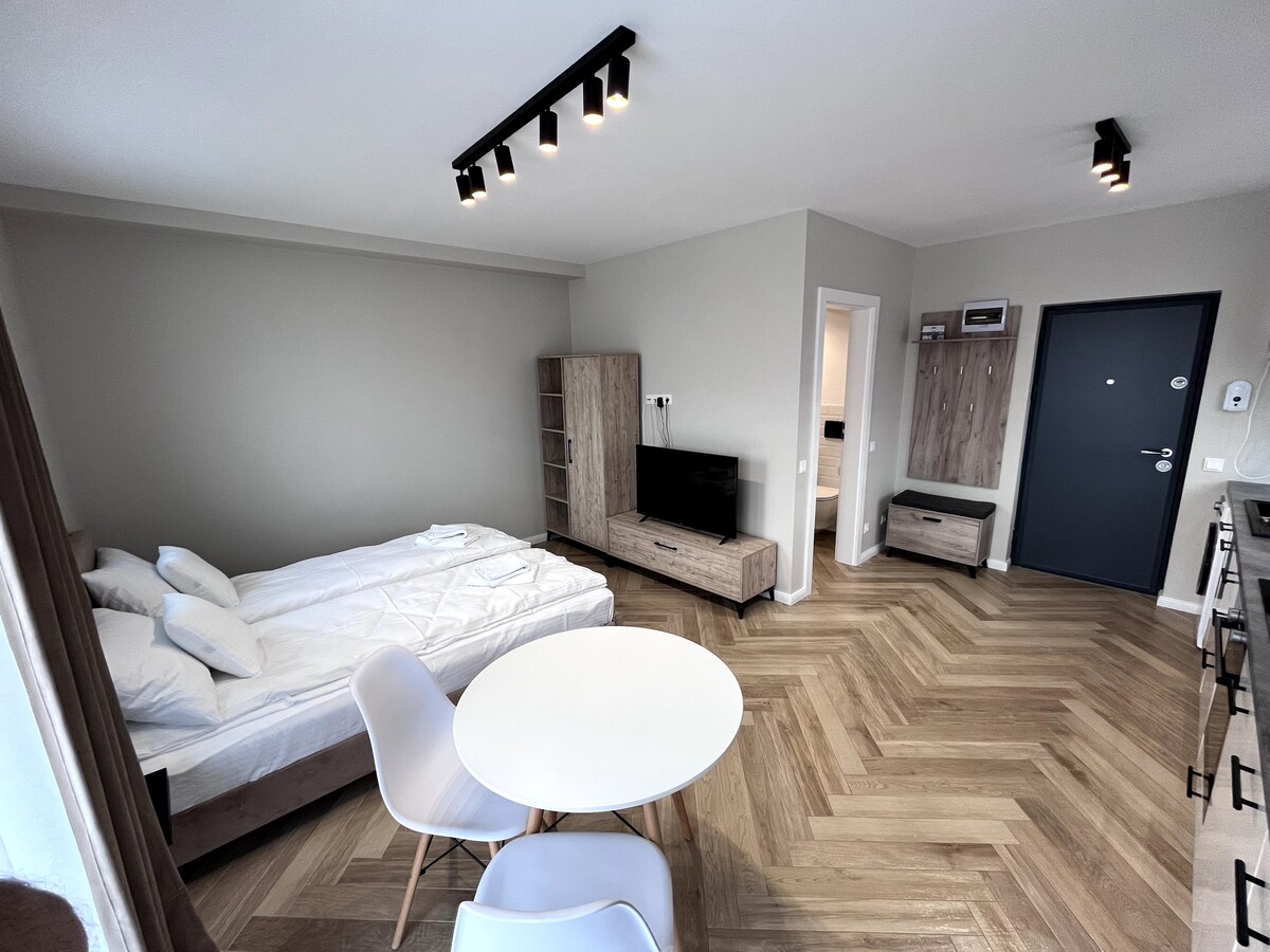 Rahat mənzil Cluj-Napocanın ən əhəmiyyətli alış-veriş və biznes zonasında, Iulius Mall-dan 30 m məsafədə, 2018-ci il düzündə yerləşir. Qonaqlarımız üçün rahat və isti mühit yaradan ən son standartlara cavab verir. Mənzil havalı, təhlükəsiz və sakitdir. Tam təchiz edilmiş, səxavətli saxlama yeri (geyinmə) olan mənzil iki otaqdan (yataq otağı və qonaq), mətbəxdən, hamam otağından və zaldan ayrı girişi olan hamam otağından ibarətdir. Rahat örtülü balkonu da var.