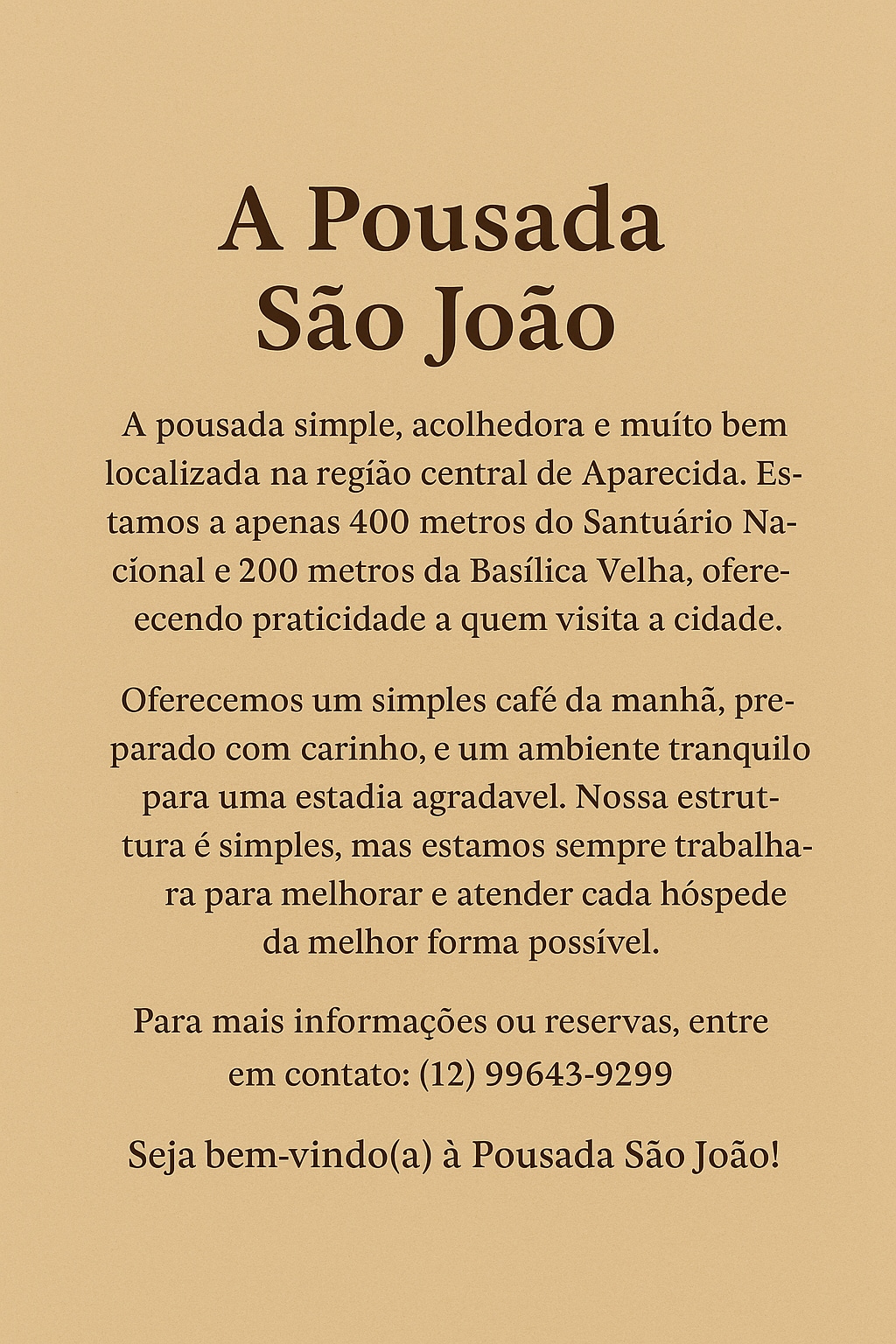 Burada dincəlmək və qonaqlamanızdan zövq almaq üçün sakit və rahat mühit tapa bilərsiniz. Otaqlarımız rifahınızı təmin etmək üçün təchiz olunub və günə ən yaxşı şəkildə başlamaq üçün ləzzətli səhər yeməyi təklif edirik. Yerli görməli yerlərə və mağazalara asanlıqla giriş imkanı olan Aparecidadan ən yaxşı şəkildə zövq almaq istəyənlər üçün ideal olan strateji mövqedəyik. Təcrübənizi daha da xüsusi etmək üçün hər zaman hazır olacağıq. Qonaqlamanızı bron edin və özünüzü evdəki kimi hiss edin!