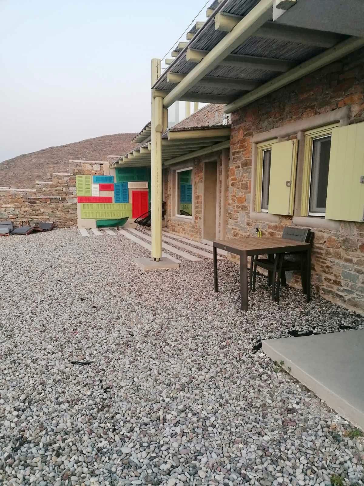 We are located on the east side of the island of Kythnos, between Kalo Livadi and Lefkes. Our lodging offers amazing views of the Aegean Sea as well as access to a beautiful secluded beach. The beach is only 80m away from the main house, and is a 5 minute descent of pathway and cement stairs. It is usually very peaceful, with only a handful of visitors resting under the two big trees, thus giving the impression of a private beach even in the heart of August.
