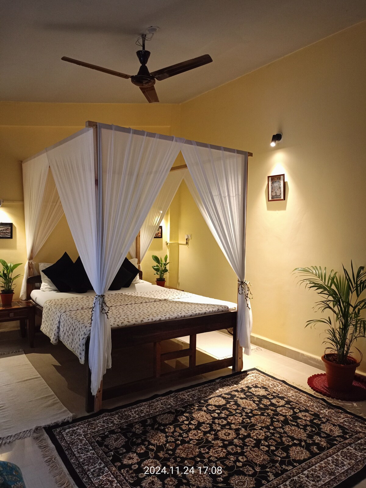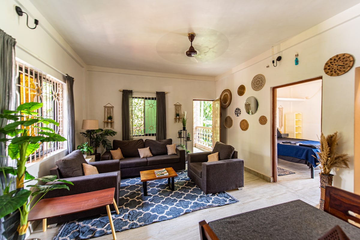 Unwind in our peaceful 1BHK, thoughtfully designed for comfort and calm. Enjoy a large balcony with stunning field views, perfect for morning coffee or sunset wine, and a shaded side balcony cooled by a big tree. The fully equipped kitchen and high-speed WiFi make life easy, while handcrafted details and warm décor create a homely, stylish charm. Every corner reflects the care of a host who’s poured heart, time, and creativity into making your Goan stay truly memorable.