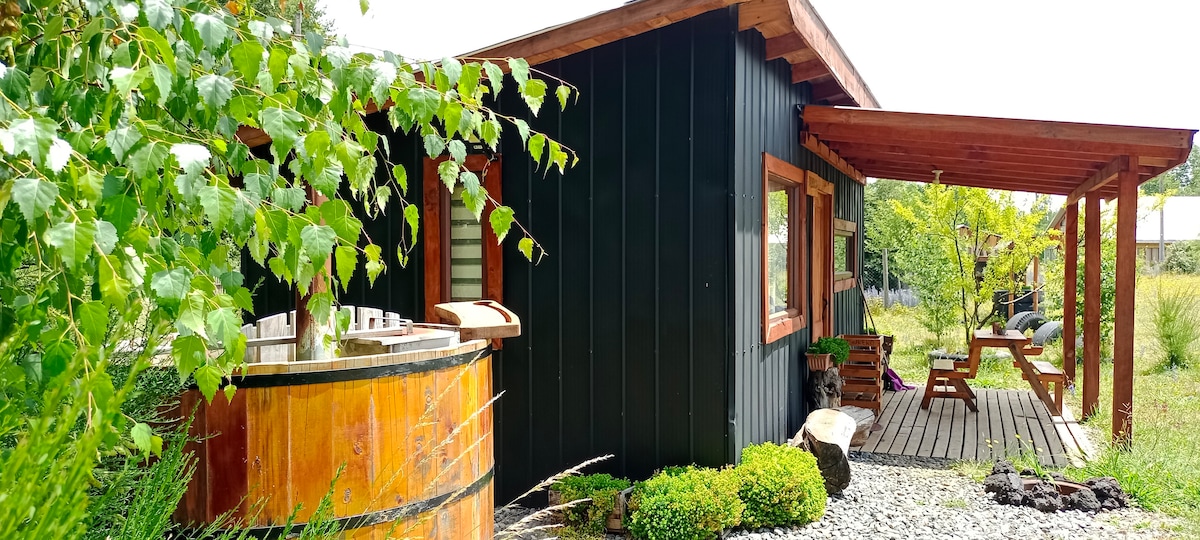 Cabaña ubicada en un campo en el Km 6 aprox de la ruta Vllca-Pucón, equipada para 4 huéspedes con sábanas, toallas, cocina con microondas, hervidor, refrigerador. Con combustión lenta, estufa eléctrica y calientacamas. Tv satelital Direct Tv. La tarifa incluye leña medio saco de leña por estadía de mayo a agosto. Hot tubs en los jardines del recinto con costo extra de $40.000 por 4 horas de uso. Se debe coordinar con un día de anticipación la reserva del Hot Tubs para su preparación.