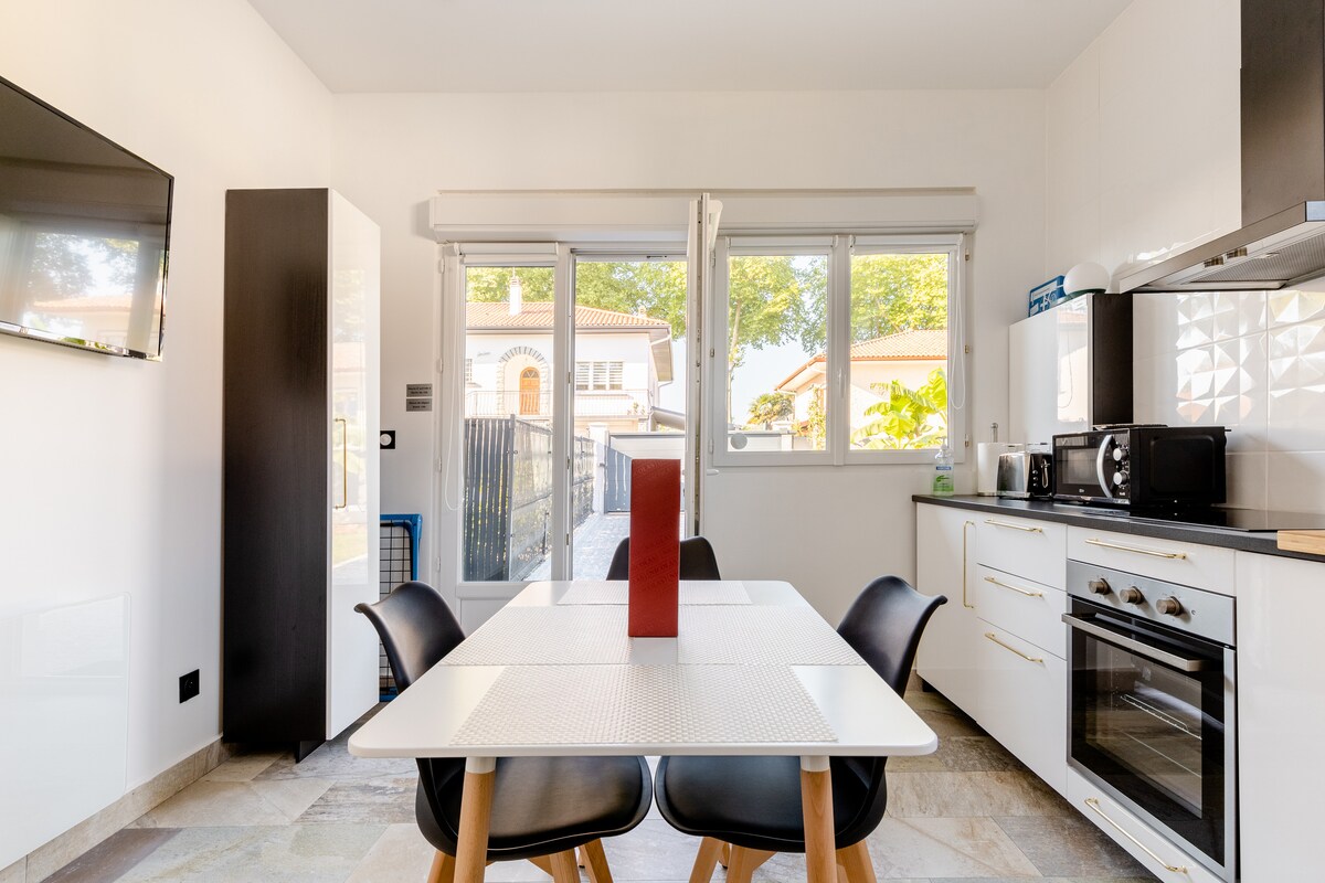 Dəniz və qolf arasında 100m2-lik yeni ev, çox parlaq , Biarritz qolfuna baxan, okeandan beş dəqiqəlik məsafədə yerləşən geniş, bir çox restoranda nahar edə biləcəyiniz genişdir. Küçədə mağazalar. 3500m2 Bali/ Yapon atmosferi olan parkinq və göyərtə, soyunub-geyinmə küncü, barbekü , brazier... Zen atmosferinə zəmanət verilir:)