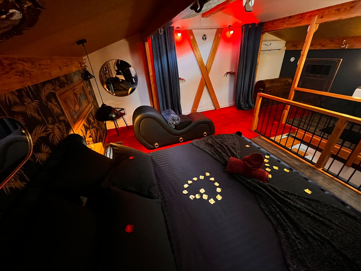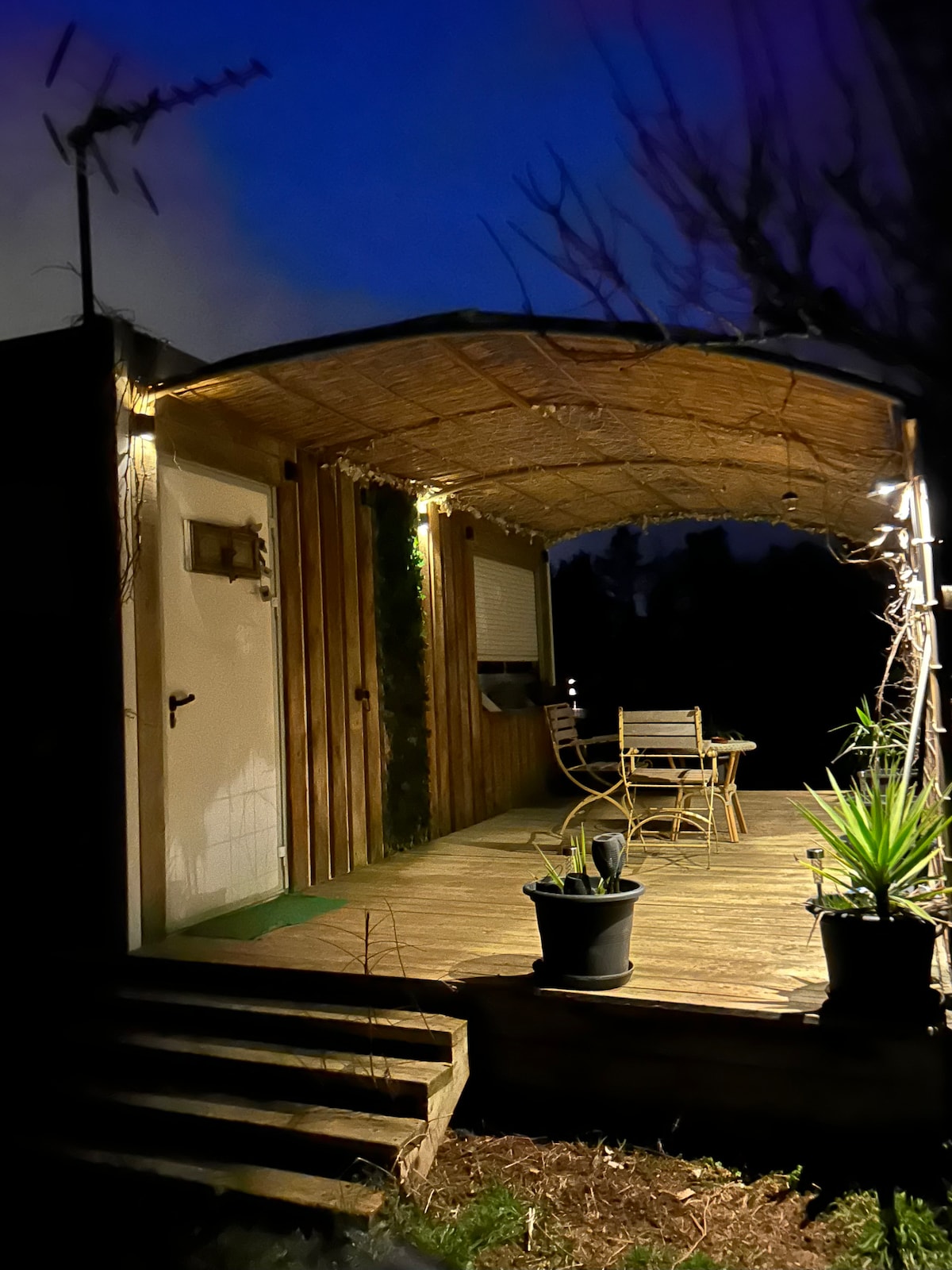Gəzəcəyiniz qısa bir yol boyunca taxta körpünün üzərindəki axarı keçin və 50 m2-lik füsunkar taxta kabinədə çəmənliklərlə əhatə olunmuş sakit ağacların altında yerləşən bu füsunkar taxta kabinə daxilində özünüzə təmiz istirahət edin. Böyük bir süitanın bütün rahatlıqlarından zövq alaraq ətrafdakı təbiətin rahatlığından zövq alın. Retro kokteyl atmosferi. Cakuzi Çarpayı 200 x 200 Kondisioner Duş Espresso maşını Kettle Mini Soyuducu Mikrodalğalı soba Oxu küncü.