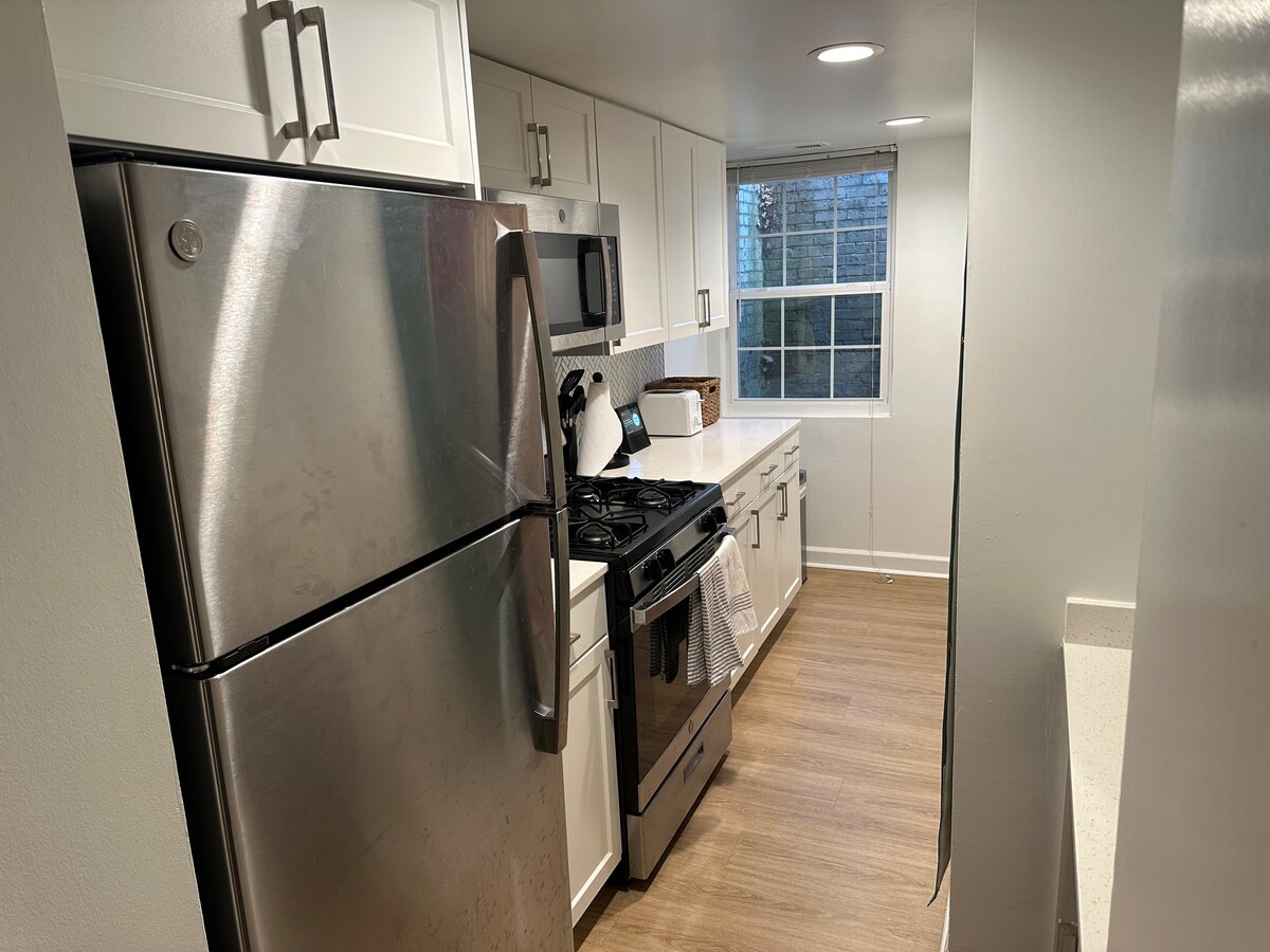 Just a few blocks from M Street and Wisconsin Ave., this modern, 1,000 square foot English basement features exclusive use of the entire lower level of a new Georgetown home and a private patio looking out onto a beautiful garden. Smart home features include voice commands for lighting, heating and cooling, a ceiling fan, door lock, and more. For working, there are two separate work spaces and fast, reliable Internet. For relaxing, we provide a full package of cable TV and streaming services.