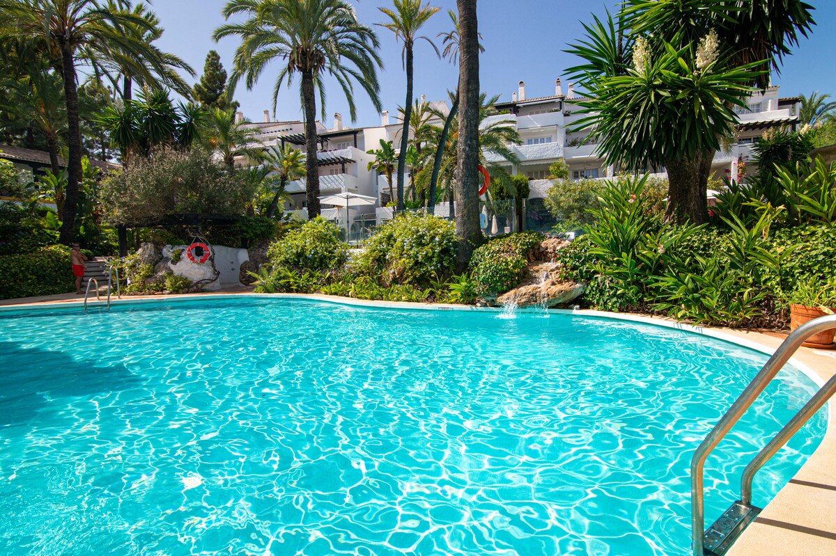 Recently back on Airbnb. Luxuriously furnished apartment located in Puente Romano phase 2 and fully equipped. The apartment is located on the Golden Mile next to the 5 star Nobu hotel. The beach with fun - and sports activities is nearby. Overlooking beautiful communal gardens and swimming pools. Lots of nice trendy restaurants/bars. Car is not necessary. The fashionable Puerto Banus and Marbella old town can be reached on foot (35 minutes) or by bus/taxi (in front of the door).