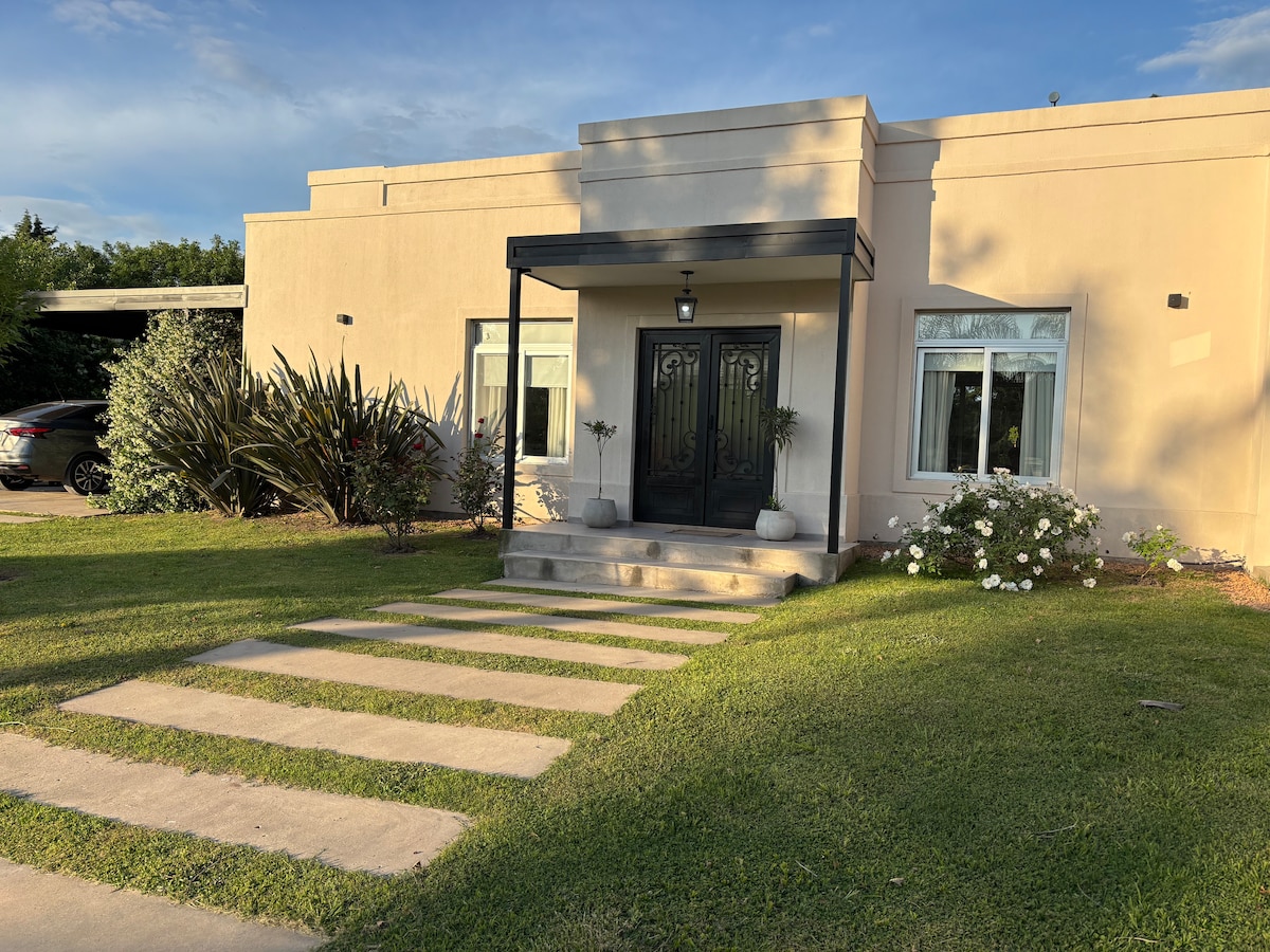 Single-story house, bright and functional, perfect for relaxing. Located in the exclusive gated community of Tessalia, in the heart of Argentina's polo region, Paraje Ellerstina, and just 50 minutes from Buenos Aires. The house features over 1,000 m² of private garden, an organic vegetable garden, a compost bin, fiber optic Wi-Fi, air conditioning in every room, and linens included. Pet-friendly: we welcome dogs! Follow us on @casaaguaribay