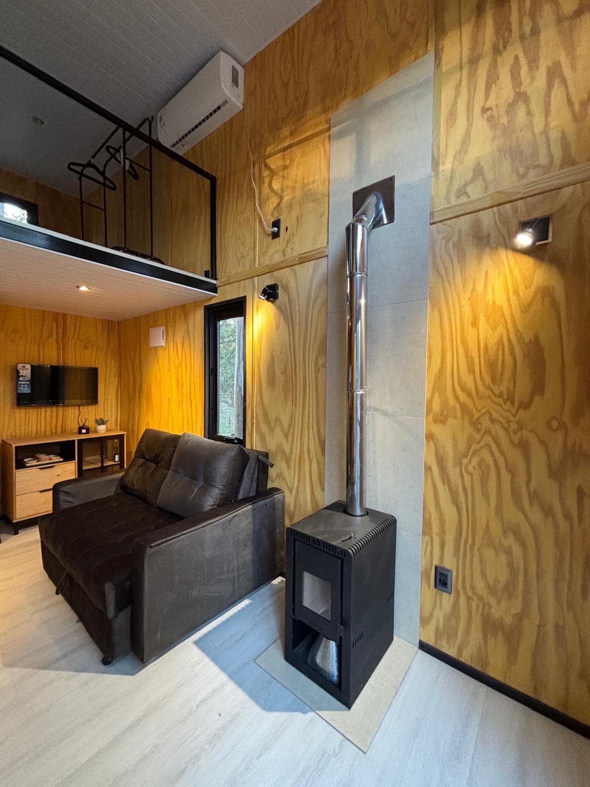 Casitas_del_ensueno: Cabaña a 50m. de la playa en medio de bosque nativo. Construida con materiales cálidos y de diseño, aberturas doble vidrio, estufa a leña, AC frio/calor, calefactores en los cuartos. Amplio espacio abierto living-cocina con todo para 4 huéspedes (max. 3 adultos), 1 dormitorio en suite con salida al deck, 2do dormitorio con cama nido (twin) y 2do baño. Wifi por FibraOptica. Pura luz y bosque a un paso del río. Estacionamiento 2 autos, parrillero, TV, hamaca, sillas de playa.