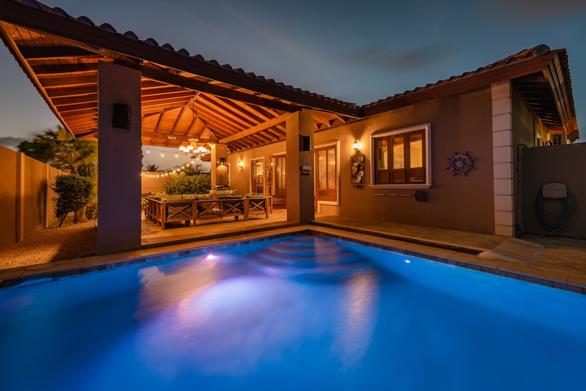This stunning, 4-bedroom, 4-and half bathroom villa offers the ultimate Aruba escape, 5 min walking distance from the island's pristine beaches. Unwind in spacious comfort as you witness breathtaking, unobstructed sunset views from your private pool and lounge area. Each bedroom boasts en-suite bathrooms and comfortable king or queen-sized beds, ensuring a restful stay for everyone. ke some memories at this unique and family-friendly place. Every room has it own outdoor access.