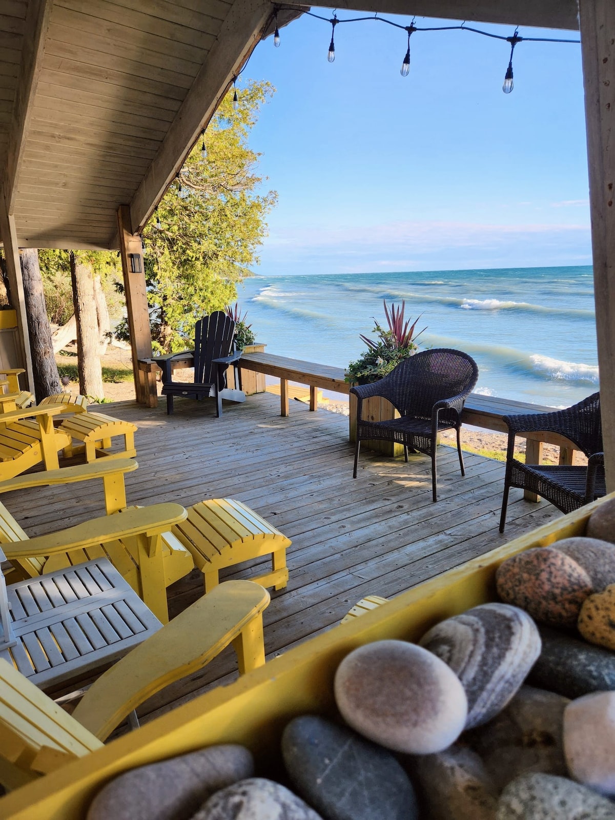 Huron gölünün sahilindəki bu rahat üçbucaq formalı istirahət məkanında ailə gölü kənarında və sidrlər arasında dincəlin. Qapı gölə 180 dərəcə mənzərəsi olan böyük qonaq otağına və mətbəxə açılır. Bar taburetləri ilə əhatə olunmuş 8 futluq ada mətbəxi anker edir. Cakuzidə yemək yeyərkən və ya islanarkən məşhur Huron gölünün qürublarını izləyin. Ön tərəfimiz od çuxuru olan qayalı çimərlikdir. Burada su ayaqqabılarımızla üzürük. Qumlu çimərlik 2 dəqiqəlik məsafədə və ya 5-10 dəqiqəlik velosiped gəzintisidir.