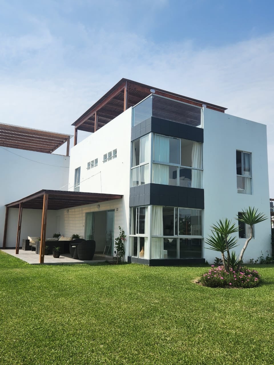 Solo para familias. A 8 minutos del Boulevar de Asia. Solo se permiten 14 personas. La casa cuenta con 5 cuartos, 6 baños, terraza en el 3er piso con pequeña piscina, sol y sombra y zona de parrilla. Cocina, horno, refrigeradora, terma, lavadora, televisores con cable y artefactos eléctricos. Estacionamiento propio. Estacionamiento para invitados dentro del condominio sujeto a disponibilidad. No están permitidas las mascotas. Incluye sábanas. No incluye toallas, jabón, champú o detergente.