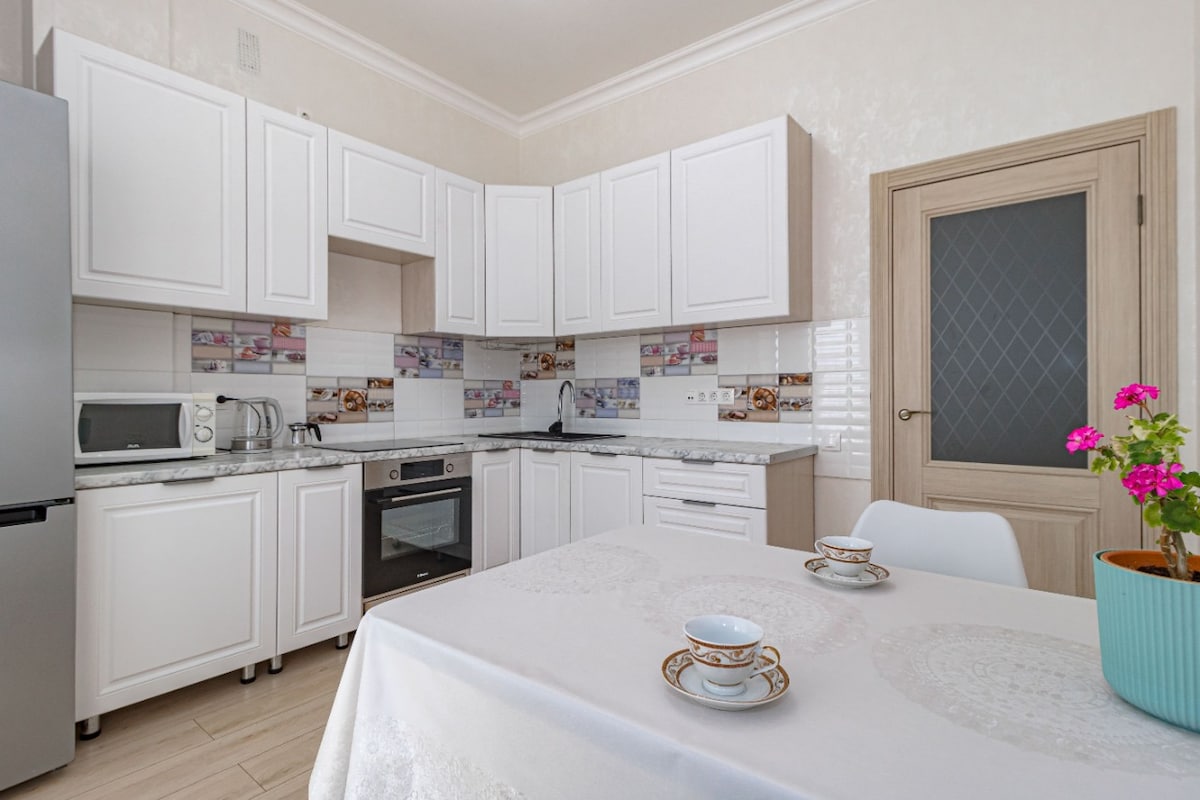 Mənzil rahat, təmiz və parlaqdır. Qonaq otağında ortopedik döşəkli ikinəfərlik çarpayı, eləcə də iki nəfərin asanlıqla açıla biləcəyi və yerləşə bilən geniş divan var. Mənzil rahat qonaqlama üçün bütün lazımi imkanlarla təchiz olunub: yüksək sürətli internet, içməli su filtri, saç feni, ütü, süfrə ləvazimatları, yataq dəsti, dəsmallar və gigiyena elementləri. Mənzil 3-4 nəfərə qədər insanı yerləşdirmək üçün uyğundur. Evin yaxınlığında mağazalar, kafelər, park və ictimai nəqliyyat dayanacağı var.