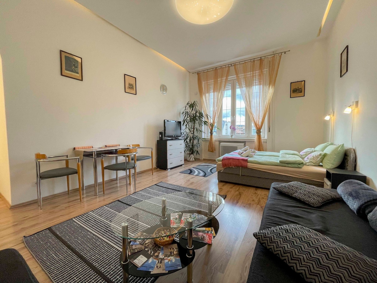 New Studio with private bathroom and kitchenette in the City Center, at the Central Shopping street and the famous Central Market Hall. We have 4 individual studios nexto to each other with king bed and pull-out sofa, private en-suite bathroom with shower and toilet, AirCon, free fast Wifi, TV, NETFLIX. Common lobby area with a fully equipped kitchen with oven, 4-plate stove, dishwasher, washing machine, dryer. The Danube, restaurants, cafés, shops, metro, tram are just around the corner.