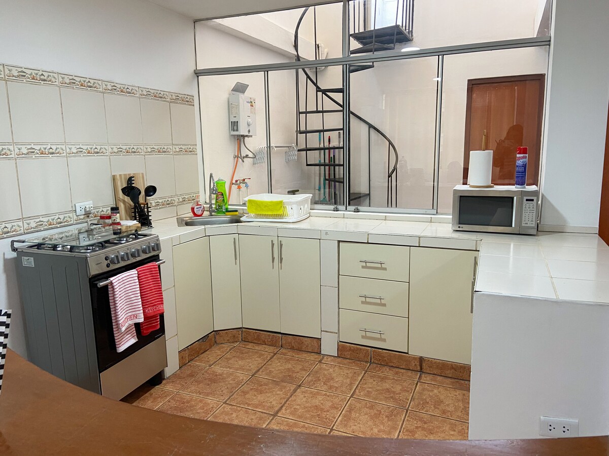 Mini depa privado e independiente en 2do. piso (acceso con escaleras) completamente amoblado, consta de tres ambientes: Dormitorio con cama queen size, amplio closet y escritorio, Wifi fibra óptica, Smart TV 50” con WinTv, Cocina/comedor, 1 sofá cama y al lado baño completo privado. Áreas comunes como terraza, jardín y piscina son de uso compartido. Barrio tranquilo y seguro, vigilancia privada. Cerca de avenidas con trasporte público, bodegas, banco, lavandería, restaurantes, farmacias, etc.