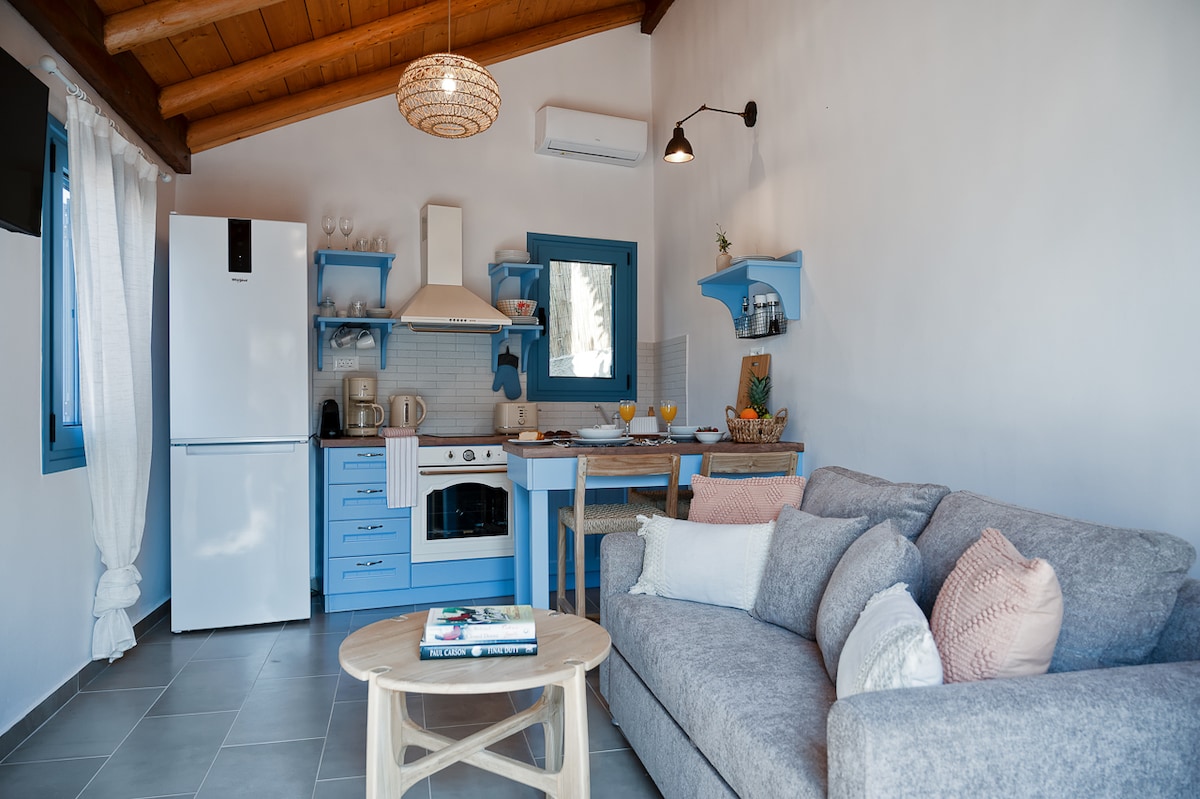 Meliti is a one level cottage, consisting of 1 bedroom which sleeps 2 guests with an en-suite bathroom. It can accommodate 1 extra guest on the living room sofa bed, or maximum 2 kids. The house offers amazing sea views from all areas, especially the view from the bed will stay memorable. Relax in the cosy sitting room, prepare dinner or relax in the outside furniture enjoying total serenity, as well as the calming sound of the sea.