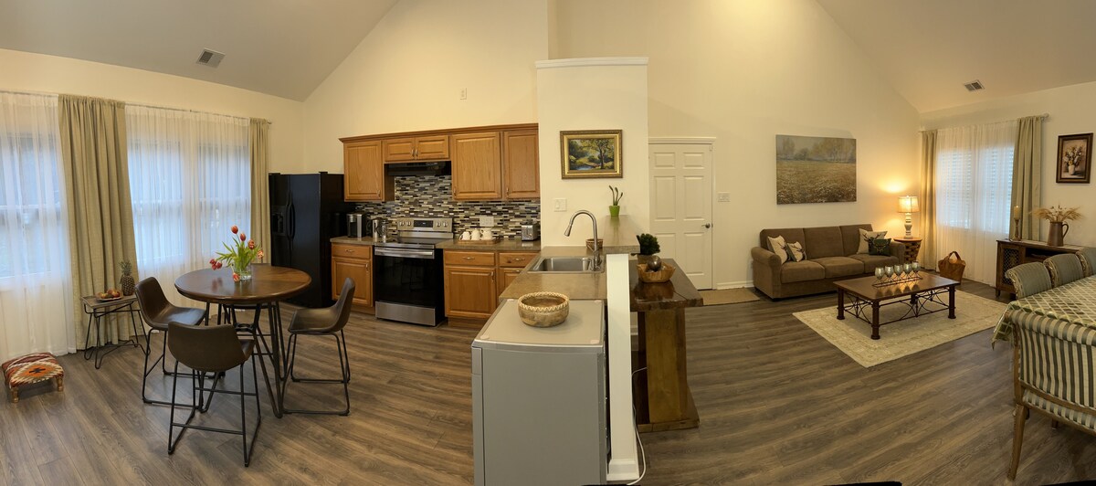 Serenity House at Swan Lake Resort: handicap-friendly, no-step design with ramp entry. Wheelchair-accessible flow throughout—wide doors, open layout. Fully fitted kitchen and large covered deck . Queen bed in one room, two extra-long twins in the other. 75-inch TV in living room, TVs in each bedroom, high-speed internet. Full kitchen, pet-friendly (on leash), short stroll to lake: kayak, trails, fishing. Quiet luxury for all—comfort without compromise.