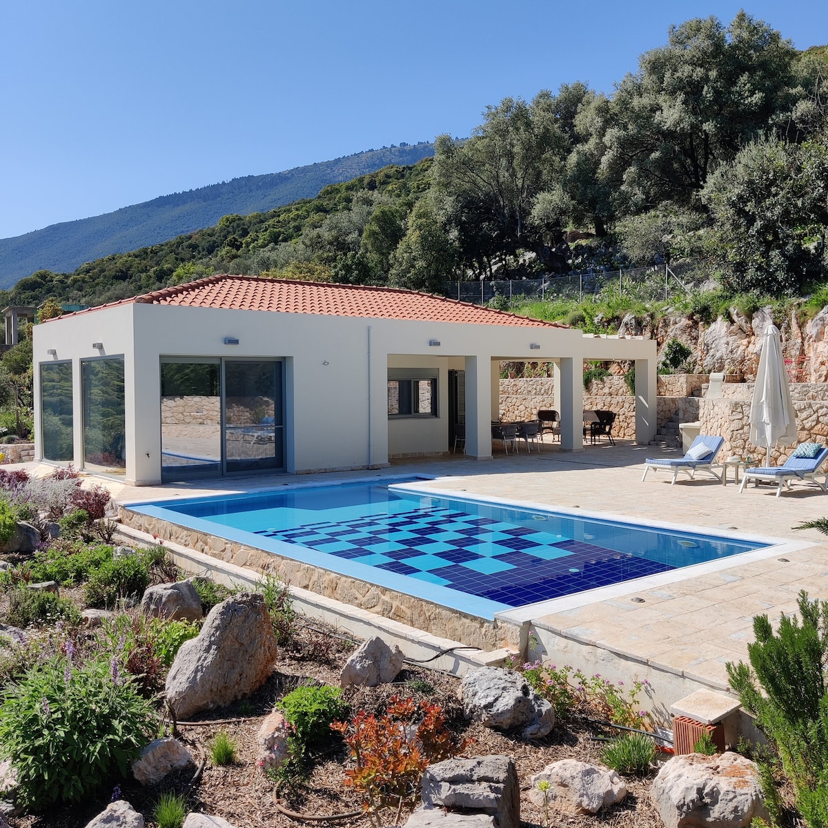 Ainos dağının ətəyində xüsusi parkinqi olan yeni tikilmiş villa. Hovuz, barbekü, yemək otağı və açıq havada mənzərəsi olan dağın mənzərəsindən zövq almaq üçün açıq hava məkanları. Təmiz təbii mühitlə əhatə olunmuş üzüm,zeytun ağacları, sərvlər və çiçəkləri olan 4,5 hektarlıq mülkdə. Uzaqdan işləyənlər üçün uyğun olan, məxfilik və istirahətdən qalan cütlüklər və dost qrupları üçün ideal məkan. Skala, Sami, Agia Efthimia, Antisamos çimərliyi və Mağaraların yaxınlığında.